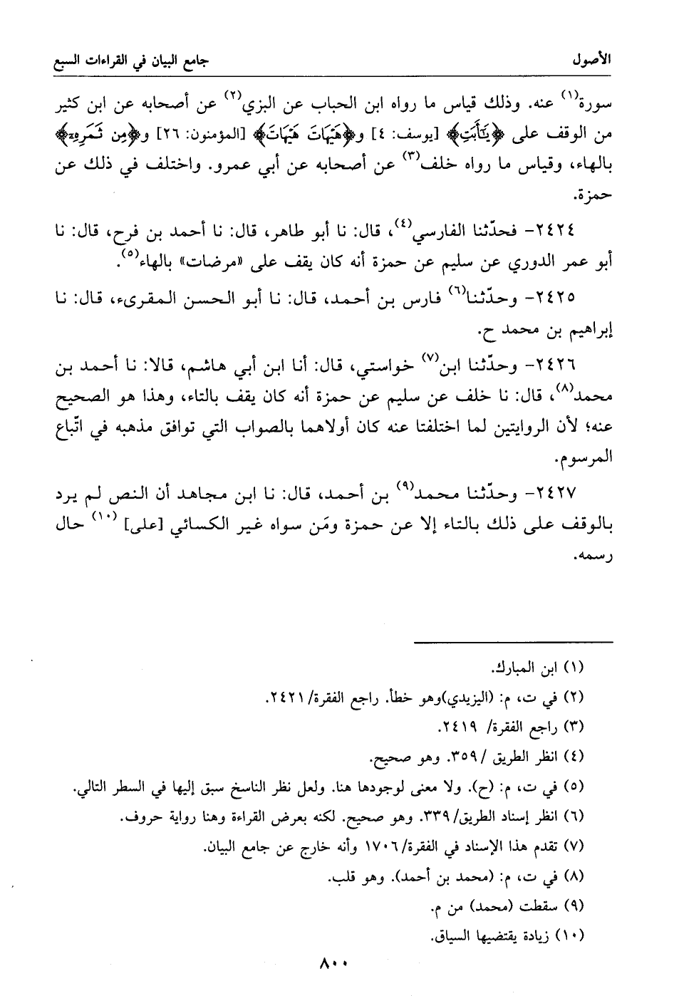 2426 - وحدّثنا ابن «7» خواستي، قال: أنا ابن أبي هاشم، قالا: نا أحمد بن محمد «8»، قال: نا خلف عن سليم عن حمزة أنه كان يقف بالتاء، وهذا هو الصحيح عنه؛ لأن الروايتين لما اختلفتا عنه كان أولاهما بالصواب التي توافق مذهبه في اتّباع المرسوم.