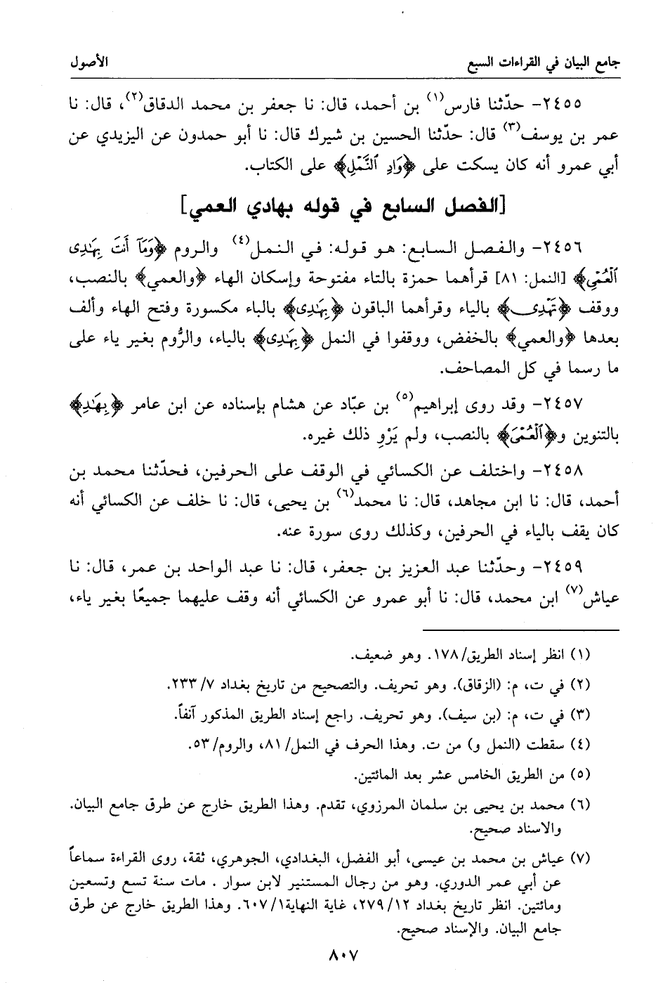 2456 - والفصل السابع: هو قوله: في النمل «4» والروم ومآ أنت بهدى العمى [النمل: 81] قرأهما حمزة بالتاء مفتوحة وإسكان الهاء والعمي بالنصب، ووقف تهدى بالياء وقرأهما الباقون بهدى بالباء مكسورة وفتح الهاء وألف بعدها والعمي بالخفض، ووقفوا في النمل بهدى بالياء، والرّوم بغير ياء على ما رسما في كل المصاحف.