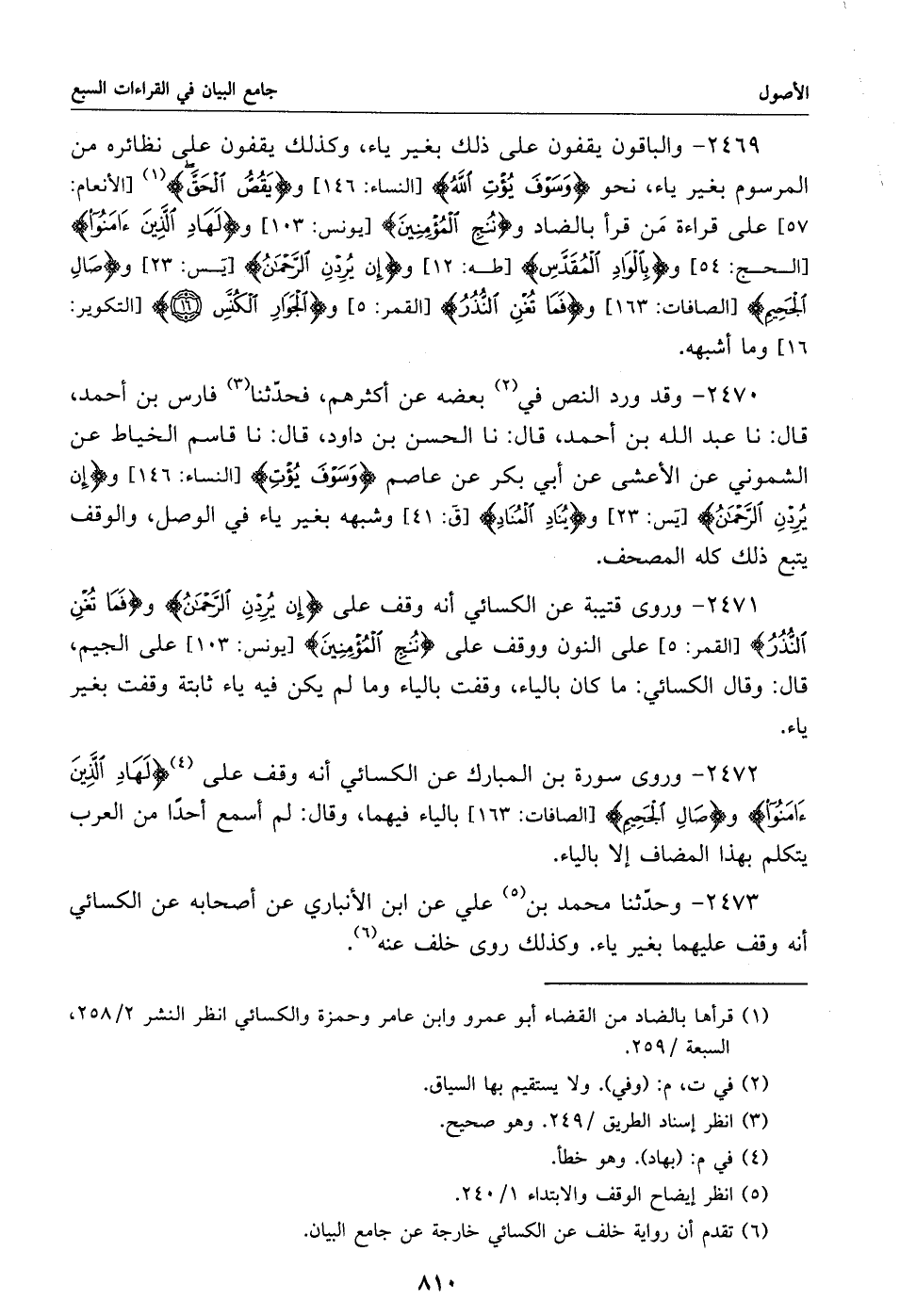 2470 - وقد ورد النص في «2» بعضه عن أكثرهم، فحدّثنا «3» فارس بن أحمد، قال: نا عبد الله بن أحمد، قال: نا الحسن بن داود، قال: نا قاسم الخياط عن الشموني عن الأعشى عن أبي بكر عن عاصم وسوف يؤت [النساء: 146] وإن يردن الرّحمن [يس: 23] ويناد المناد [ق: 41] وشبهه بغير ياء في الوصل، والوقف يتبع ذلك كله المصحف.