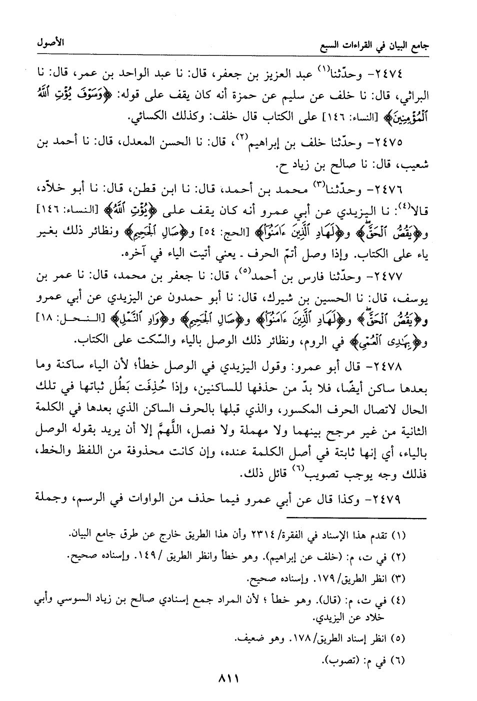 2476 - وحدّثنا «3» محمد بن أحمد، قال: نا ابن قطن، قال: نا أبو خلّاد، قالا «4»: نا اليزيدي عن أبي عمرو أنه كان يقف على يؤت الله [النساء: 146] ويقصّ الحقّ ولهاد الّذين ءامنوا [الحج: 54] وصال الجحيم ونظائر ذلك بغير ياء على الكتاب. وإذا وصل أتمّ الحرف- يعني أتيت الياء في آخره.