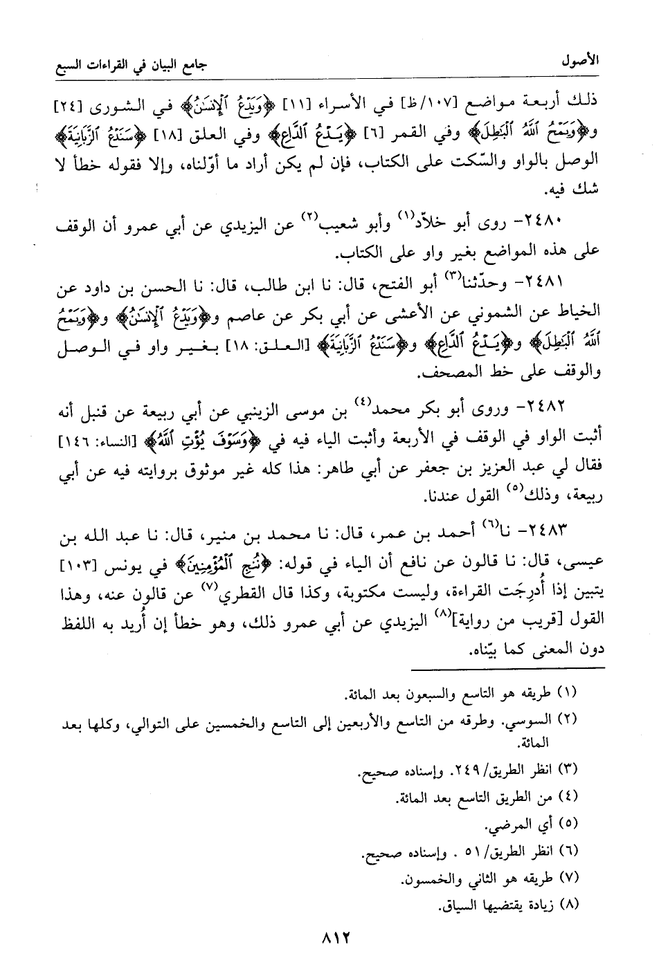 2481 - وحدّثنا «3» أبو الفتح، قال: نا ابن طالب، قال: نا الحسن بن داود عن الخياط عن الشموني عن الأعشى عن أبي بكر عن عاصم وو يدع الإنسن وو يمح الله البطل ويدع الدّاع وسندع الزّبانية [العلق: 18] بغير واو في الوصل والوقف على خط المصحف.