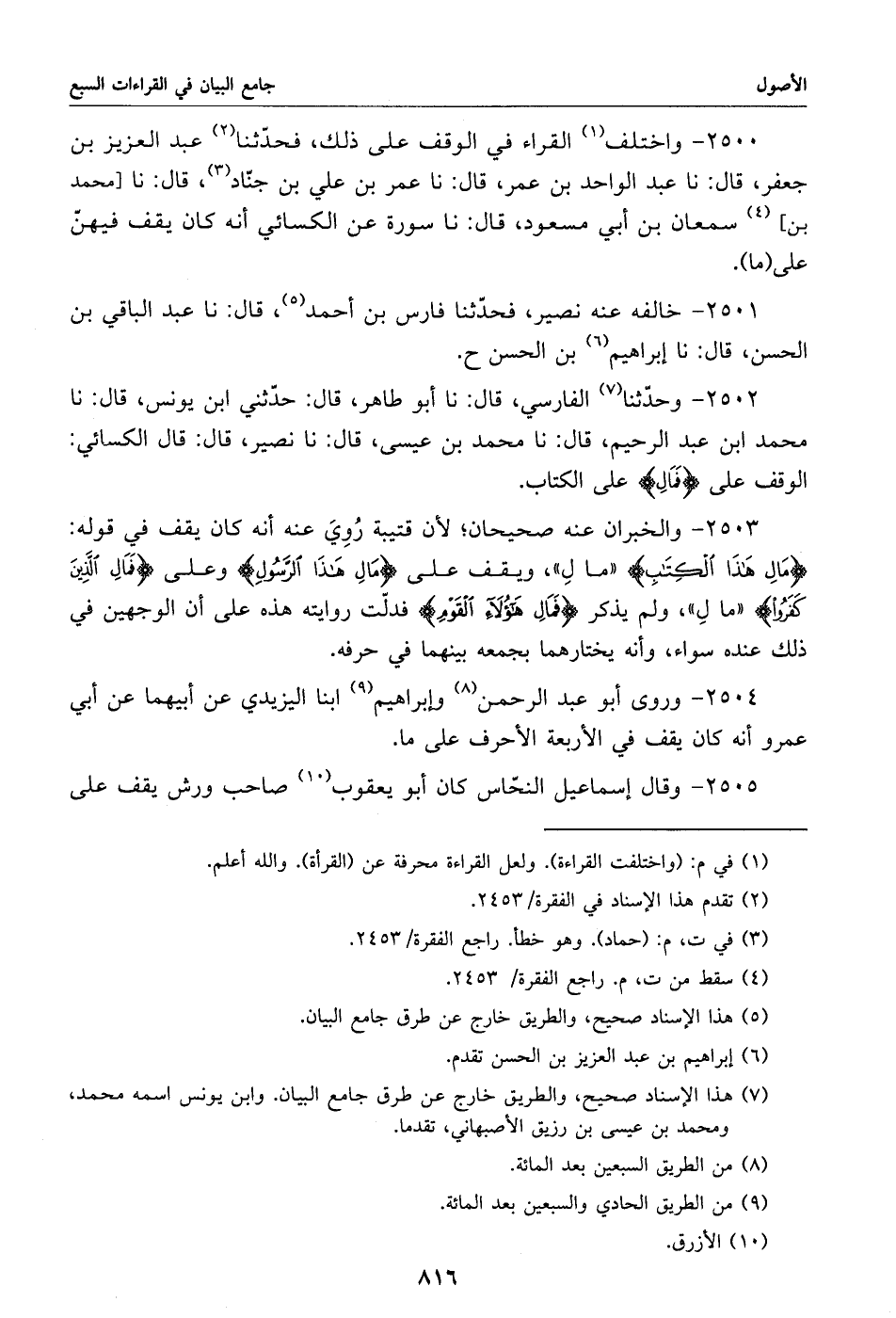 2500 - واختلف «1» القراء في الوقف على ذلك، فحدّثنا «2» عبد العزيز بن جعفر، قال: نا عبد الواحد بن عمر، قال: نا عمر بن علي بن جنّاد «3»، قال: نا [محمد بن] «4» سمعان بن أبي مسعود، قال: نا سورة عن الكسائي أنه كان يقف فيهنّ على (ما).