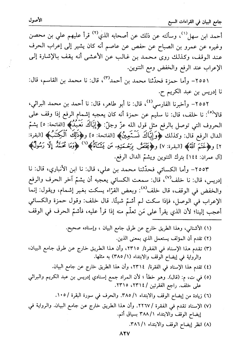 2552 - وأخبرنا الفارسي «4»، قال: نا أبو طاهر، قال: نا أحمد بن محمد البراثي، قالا «5»: نا خلف، قال: نا سليم عن حمزة أنه كان يعجبه إشمام الرفع إذا وقف على الحروف التي توصل بالرفع مثل قول الله عزّ وجلّ: إيّاك نعبد [الفاتحة: 5] يشمّ الدال الرفع قال: وكذلك وإيّاك نستعين [الفاتحة: 5] وذلك الكتب [البقرة:
