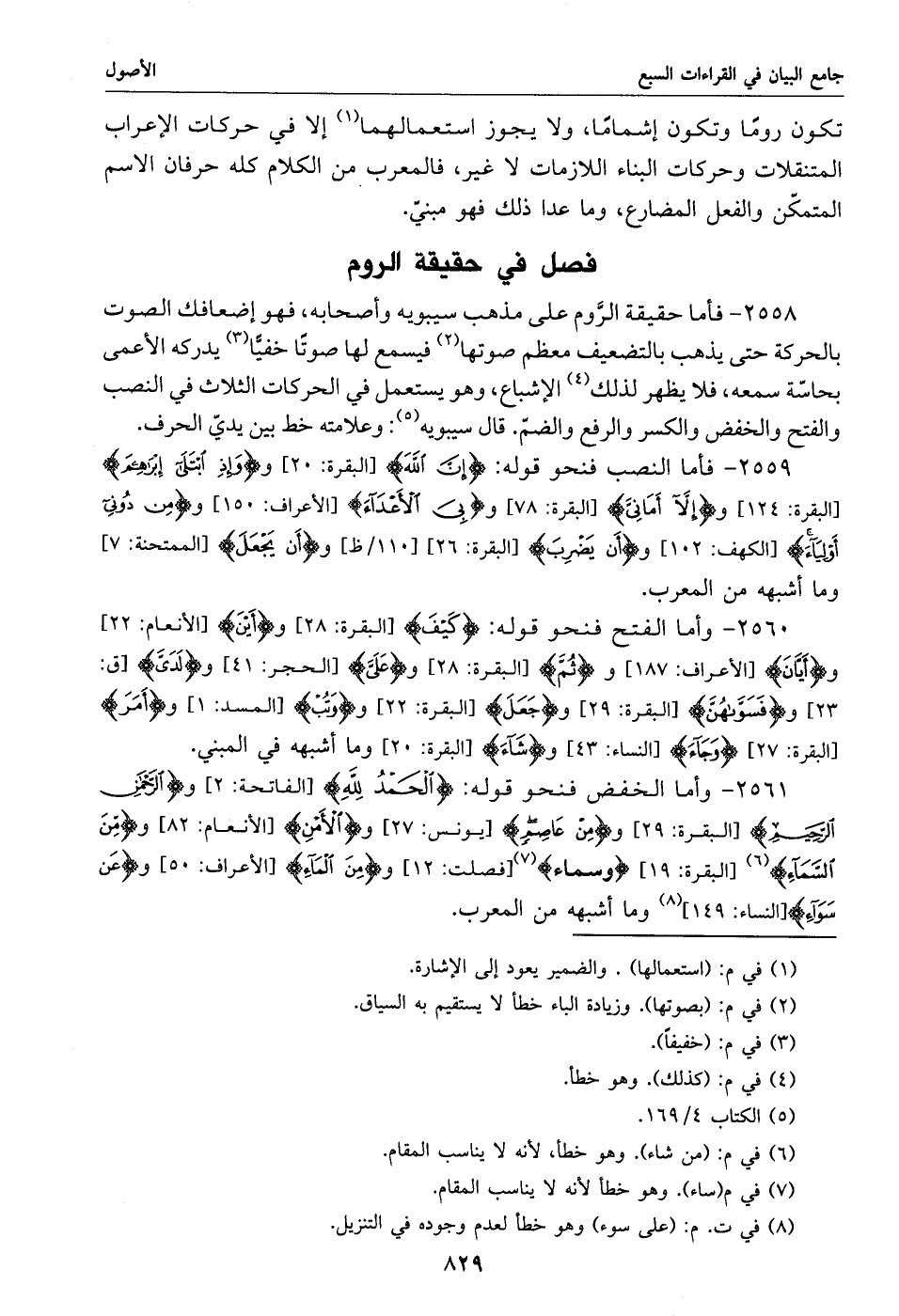 2558 - فأما حقيقة الرّوم على مذهب سيبويه وأصحابه، فهو إضعافك الصوت بالحركة حتى يذهب بالتضعيف معظم صوتها «2» فيسمع لها صوتا خفيّا «3» يدركه الأعمى بحاسّة سمعه، فلا يظهر لذلك «4» الإشباع، وهو يستعمل في الحركات الثلاث في النصب والفتح والخفض والكسر والرفع والضمّ. قال سيبويه «5»: وعلامته خط بين يديّ الحرف.