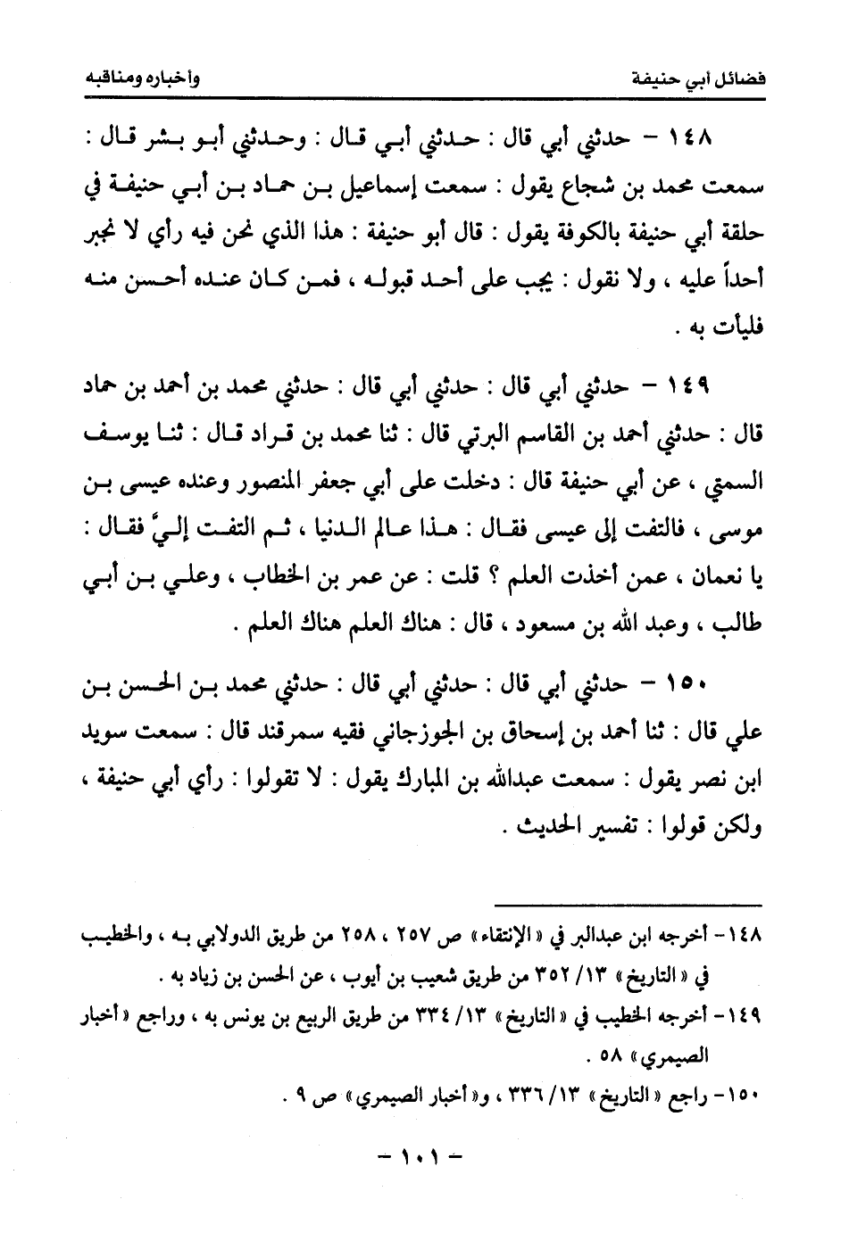 151 - حدثني أبي قال: حدثني أبي قال: حدثني أحمد بن محمد بن سلامة قال: ثنا محمد بن العباس بن الربيع وإبراهيم بن أبي داود وعلي بن عبد الرحمن بن المغيرة قالوا: ثنا علي بن معبد بن شداد قال: ثنا عبيد الله بن عمرو قال: كنا عند الأعمش وعنده أبو حنيفة فسئل الأعمش عن مسألة، فقال لأبي حنيفة: أفته يا نعمان، فأفتاه أبو حنيفة، فقال له الأعمش: من أين قلت هذا؟ قال: لحديث حدثتناه أنت، ثم ذكر الحديث، فقال له الأعمش: أنتم الأطباء ونحن الصيادلة.