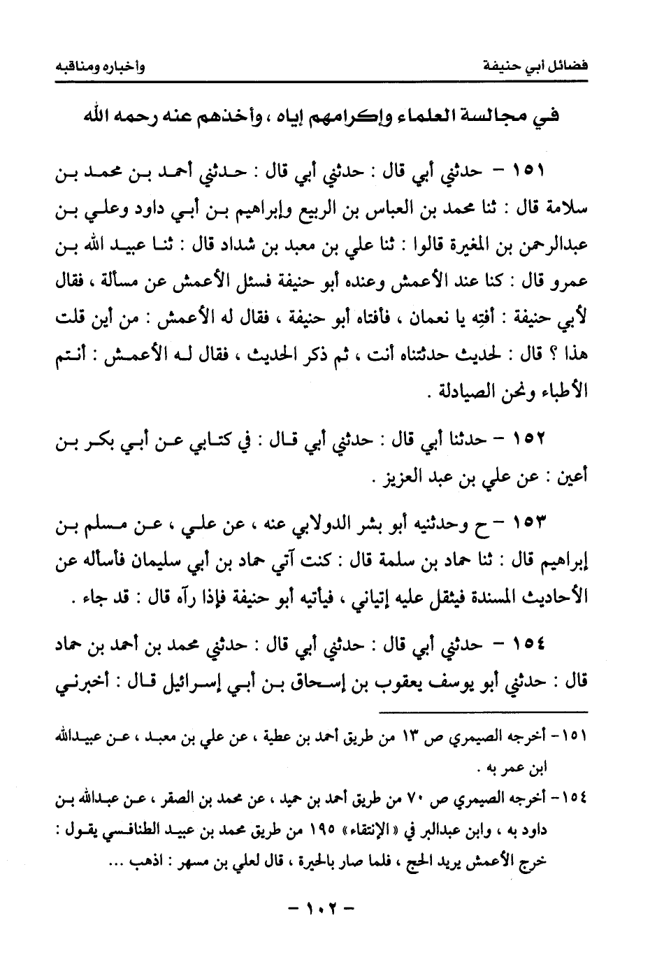 157 - حدثني أبي قال: حدثني أبي قال: حدثني محمد بن أحمد بن حماد #104# قال: حدثني يعقوب بن إسحاق بن أبي إسرائيل قال: حدثني أبي قال: ثنا عبد الرزاق بن همام قال: قال لي معمر: سل أبا حنيفة، قال عبد الرزاق: وإنما قال هذا لينظر في رأيه يوافقه فيما يقول أو يخالفه، وكان معمر يقول في الشيء برأيه فيحب أن يعلم ما يقولون فيه.