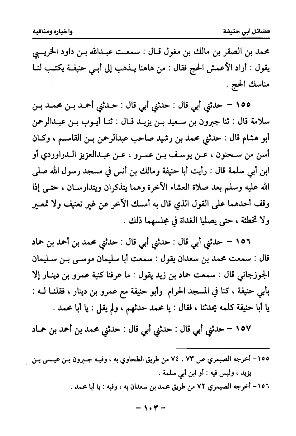 159 - حدثني أبي قال: حدثني أبي قال: حدثني محمد بن أحمد بن حماد قال: حدثني أحمد بن القاسم قال: ثنا محمد بن عبد العزيز بن أبي رزمة قال: سمعت أبي يقول: قال حماد بن زيد: كان جرير بن عبد الحميد خالفني في شيخ فسألت أبا حنيفة عنه، فتابعني على قولي، وقال لي أصحابه: إنه يروي عن هذا الشيخ.