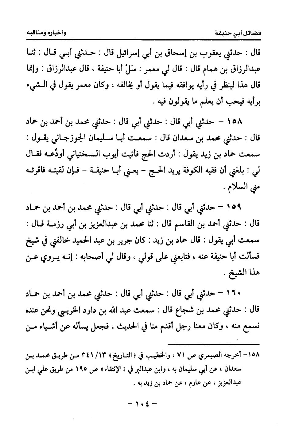 161 - حدثني أبي قال: حدثني أبي قال: حدثني أحمد بن محمد بن سلامة قال: ثنا جعفر بن أحمد بن الوليد الأسلمي قال: ثنا يحيى بن سليمان، عن علي بن مسهر قال: كنا نأتي سفيان الثوري فنسأله عن المسائل فيجيبنا فيها بغير قول أبي حنيفة، فنخبره بقول أبي حنيفة، فإذا كان بعد ذلك سألناه عنها فيجيبنا فيها بقول أبي حنيفة، فذكرنا ذلك لأبي حنيفة فقال: تفقهوه وتعلموه.