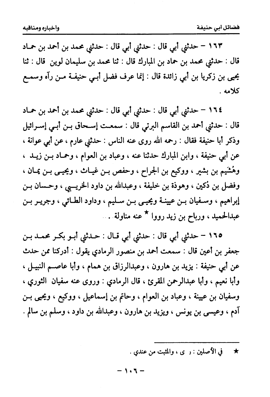 166 - حدثني أبي قال: حدثني أبي قال: حدثني أحمد بن محمد بن سلامة أبو جعفر قال: حدثني محمد بن العباس اللؤلؤي قال: ثنا العباس بن طالب قال: ثنا عبد الواحد بن زياد قال: قدمت الكوفة فرأيت أبا حنيفة يناظر حماد بن أبي سليمان، وعلى حماد طويلة سوداء، فجعل أبو حنيفة يحتج عليه حتى تقطعت أزرار حماد، وأخذ الطويلة فضرب بها إلى الأرض.