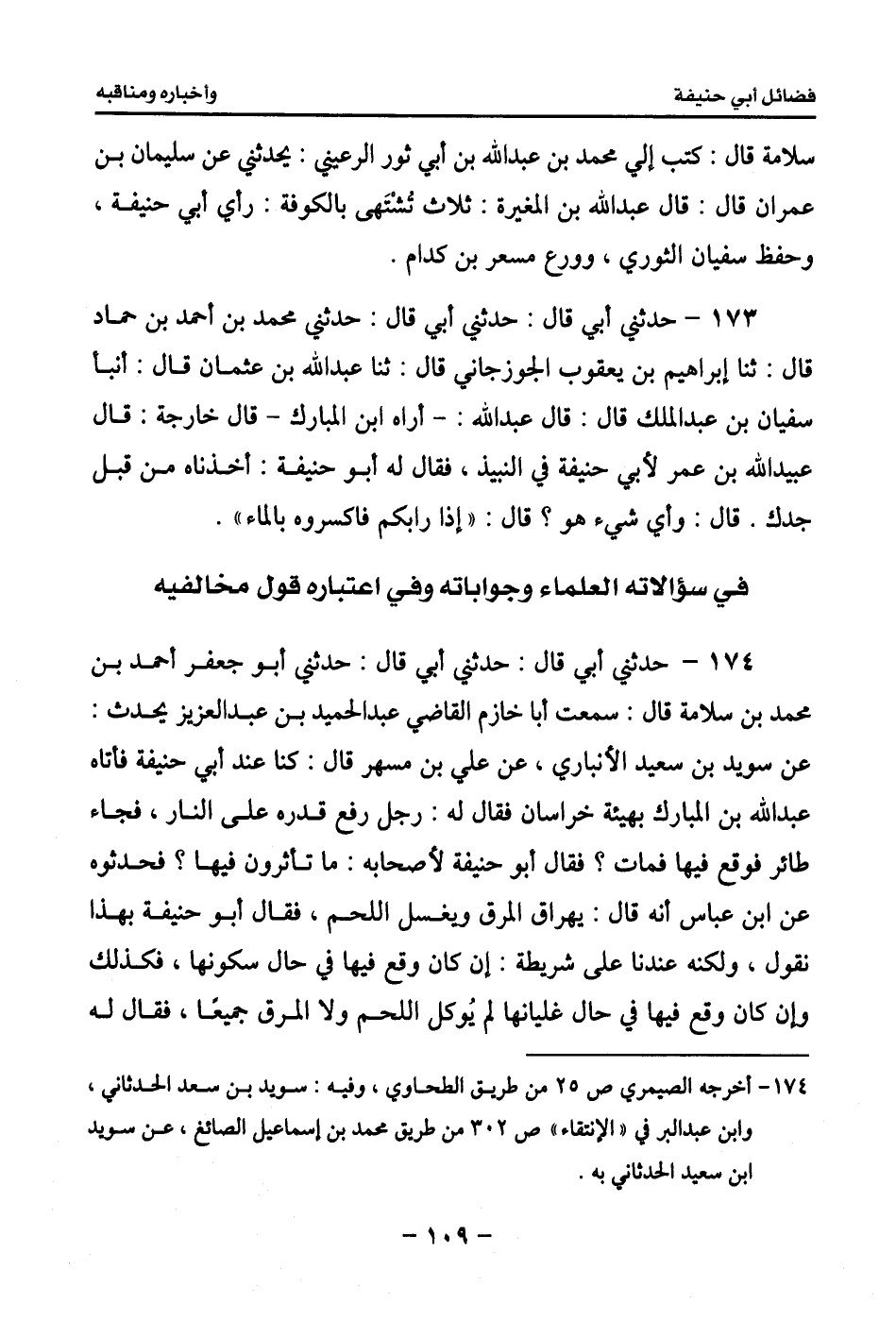 175 - حدثني أبي قال: حدثني أبي قال: حدثني إبراهيم بن أحمد بن سهل الترمذي قال: حدثني أبو موسى عيسى بن أبي راشد قال: ثنا أبو عمر قال: سمعت أبا الليث الجرجاني يقول: أنبأ أبو الأصبع الكوفي قال: بلغني أن قتادة قدم الكوفة فقال: يا أهل الكوفة سلوني، فقام إليه أبو حنيفة فقال: يا أبا الخطاب، ما تقول في رجل.