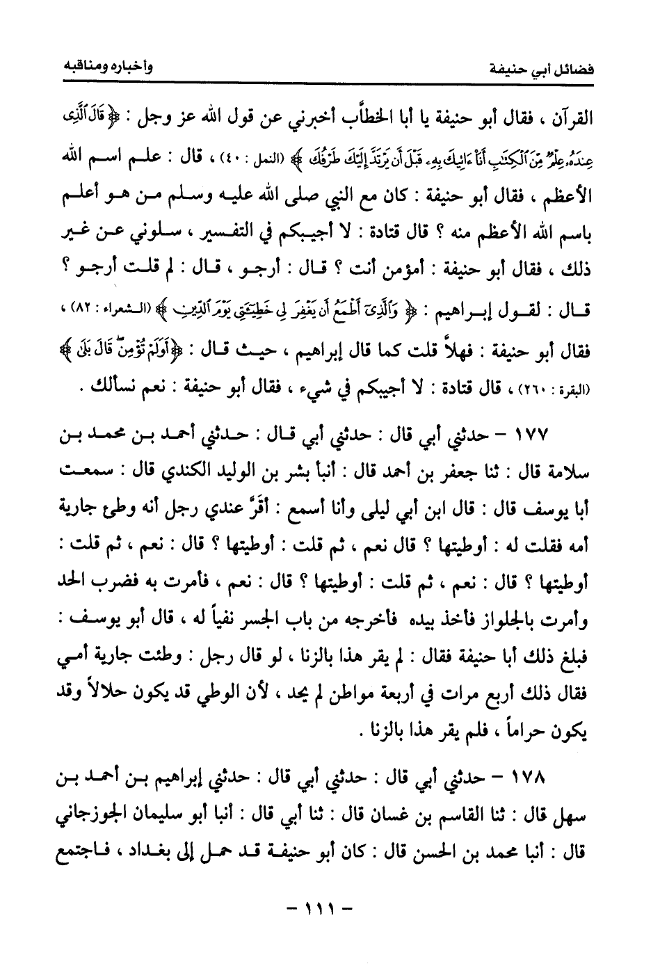 179 - حدثني أبي قال: حدثني أبي قال: حدثني أحمد بن محمد بن سلامة قال: سمعت أحمد بن أبي عمران يحدث: عن الوليد بن حماد الكوفي قال: قلت لعمي الحسن بن زياد: ألست قد رأيت زفر بن الهذيل وأبا يوسف عند أبي حنيفة؟ قال: بلى، قلت: فكيف رأيتهما عنده؟ قال: كعصفورين قد #113# انقض عليهما بازي.