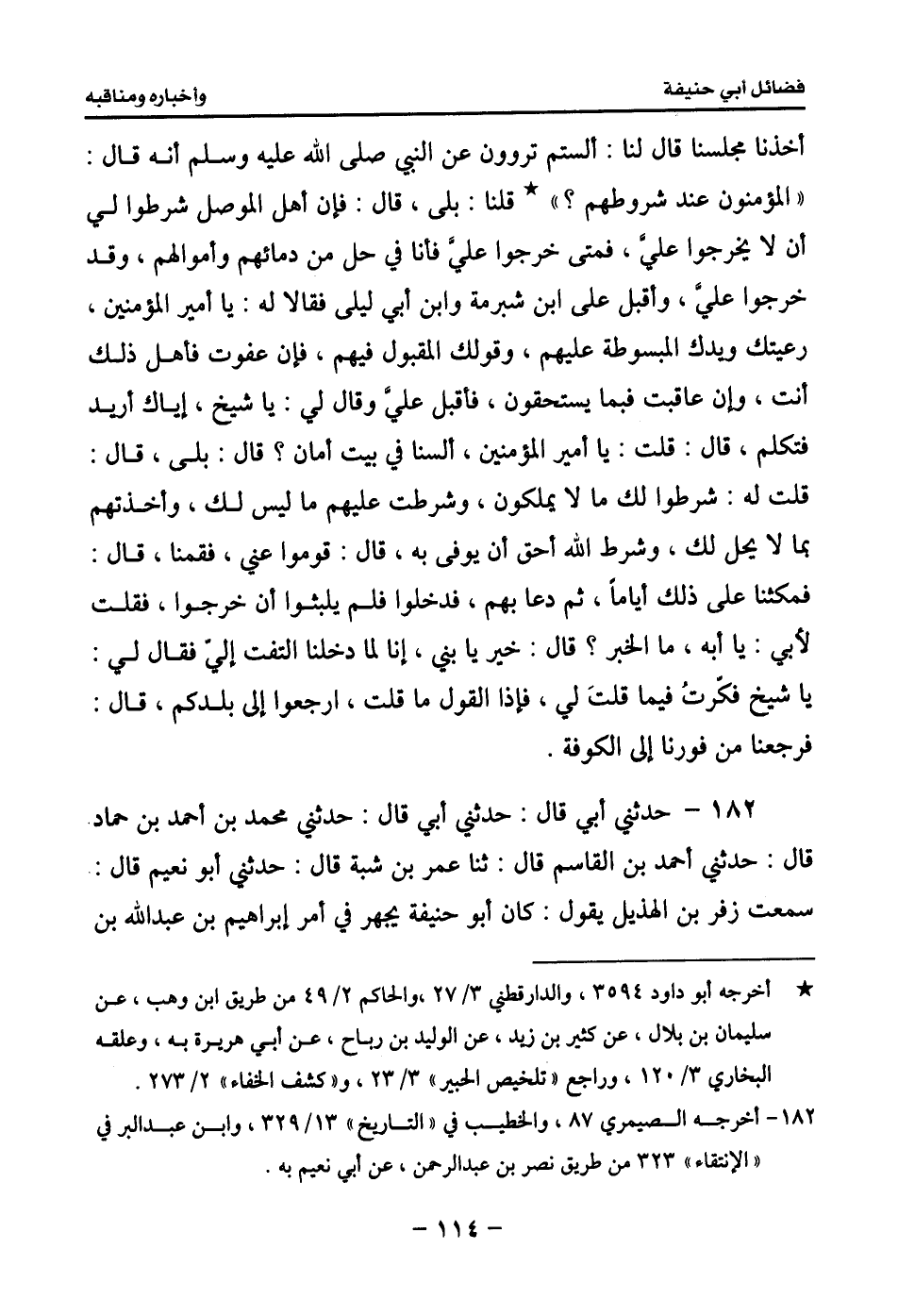 183 - حدثني أبي قال: حدثني أبي قال: حدثني محمد بن أحمد بن حماد قال: سمعت أبا عبد الله محمد بن شجاع يقول: سمعت شيخاً يكنى أبا معشر يحدث بهذا الحديث، فسألت الحسن بن أبي مالك عنه، فقال: هذا مشهور من أمره ما زلنا نتذاكر هذا ونتحدث به، قال: جيء بالحسن بن عمارة إلى أبي جعفر المنصور فأمر له بجائزة، قال: فجاء الحسن بن عمارة إلى أبي حنيفة فقال له: يا أبا حنيفة قد احتجت إليك اليوم وإلى رأيك، قد أمر لي بجائزة، وذكر ألوف دراهم، فإن لم أقبلها خشيت أن أقتل، فاحتل لي في صرفها عني. فقال له أبو حنيفة: لا تردها ولا تقتضيها، فلست تبتدأ بها، ففعل الحسن ذلك فلم يأخذها ولم يبتدأ بها، قال وأمر لأبي حنيفة بعشرة آلاف درهم، وكان المتولي لإعطاء ذلك: الحسن بن قحطبة، فلما أحس أبو حنيفة بأنه يرسل بها إليه، وكذلك أمر الحسن بن قحطبة تمارض أبو حنيفة، فلما كان اليوم الذي قيل إنه يرسل بها فيه أصبح أبو حنيفة ذلك اليوم لا يكلم أحداً كأنه مغمى عليه، وأتي في ذلك اليوم بالدراهم، جاء بها رسول الحسن ابن قحطبة، فدخل عليه، فقالوا له: ما تكلم اليوم بكلمة، قال: فكيف أصنع؟ قالوا: أنظر ما #116# ترى، قال: فوضعها في مسجد في ناحية البيت وانصرف، قال: فمكثت تلك البدرة في ذلك الموضع إلى أن مات أبو حنيفة، وكان ابنه حماد غائباً، فقدم بعد موته فحمل البدرة، فأتى بها باب الحسن بن قحطبة فاستأذن، فأذن له، فدخل فقال: إني وجدت في وصية أبي إذا أنا مت ودفنت فخذ هذه البدرة التي في زاوية البيت فائت بها الحسن بن قحطبة وقل له: هذه وديعتكم التي كانت عندنا، قال: فأدخلت البدرة فنظر إليها الحسن بن قحطبة، ثم قال لحماد: رحم الله أباك لقد شح على دينه إذ سخت به أنفس القوم.