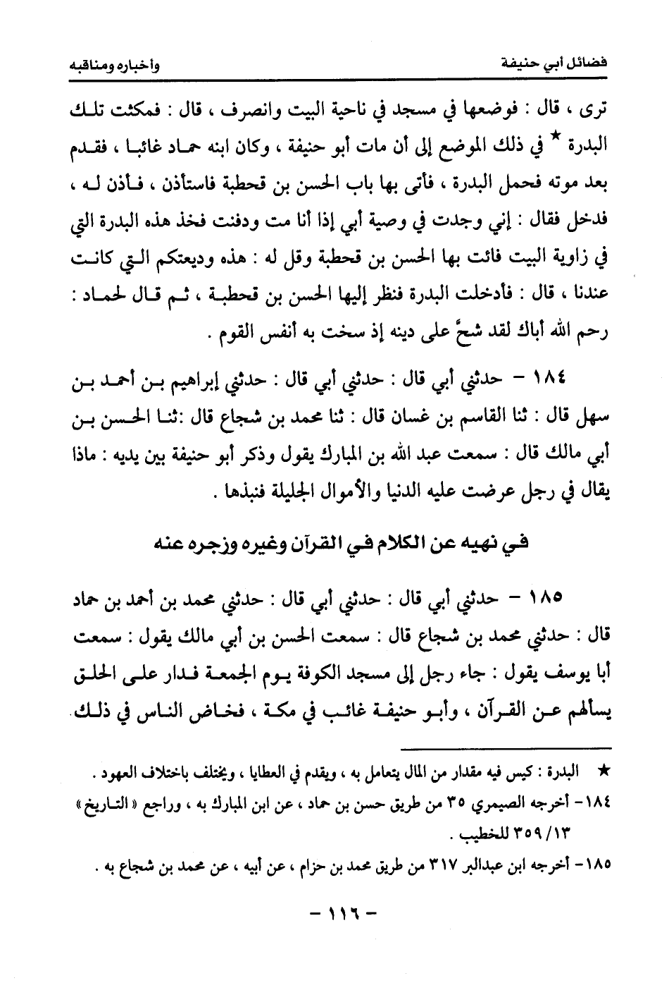 186 - حدثني أبي قال: حدثني أبي قال: حدثني محمد بن أحمد بن حماد قال: سمعت محمد بن شجاع يقول: سمعت الحسن بن زياد اللؤلؤي، يقول: أتيت داود الطائي أنا وحماد بن أبي حنيفة فجرى ذكر شيء، فقال داود الطائي لحماد: يا أبا إسماعيل مهما تكلم فيه المتكلم من شيء رجاء أن يسلم منه، فليحذر أن يتكلم في القرآن إلا بما قال الله عز وجل فيه، فلقد سمعت أباك -يعني أبا حنيفة- يقول: أعلمنا الله أنه كلامه، فمن أخذ بما علمه الله فقد #118# استمسك بالعروة الوثقى. فهل بعد التمسك بالعروة الوثقى إلا السقوط في الهلكة، فقال حماد لداود: جزاك الله خيراً من أخٍ، فنعم ما أشرت به.