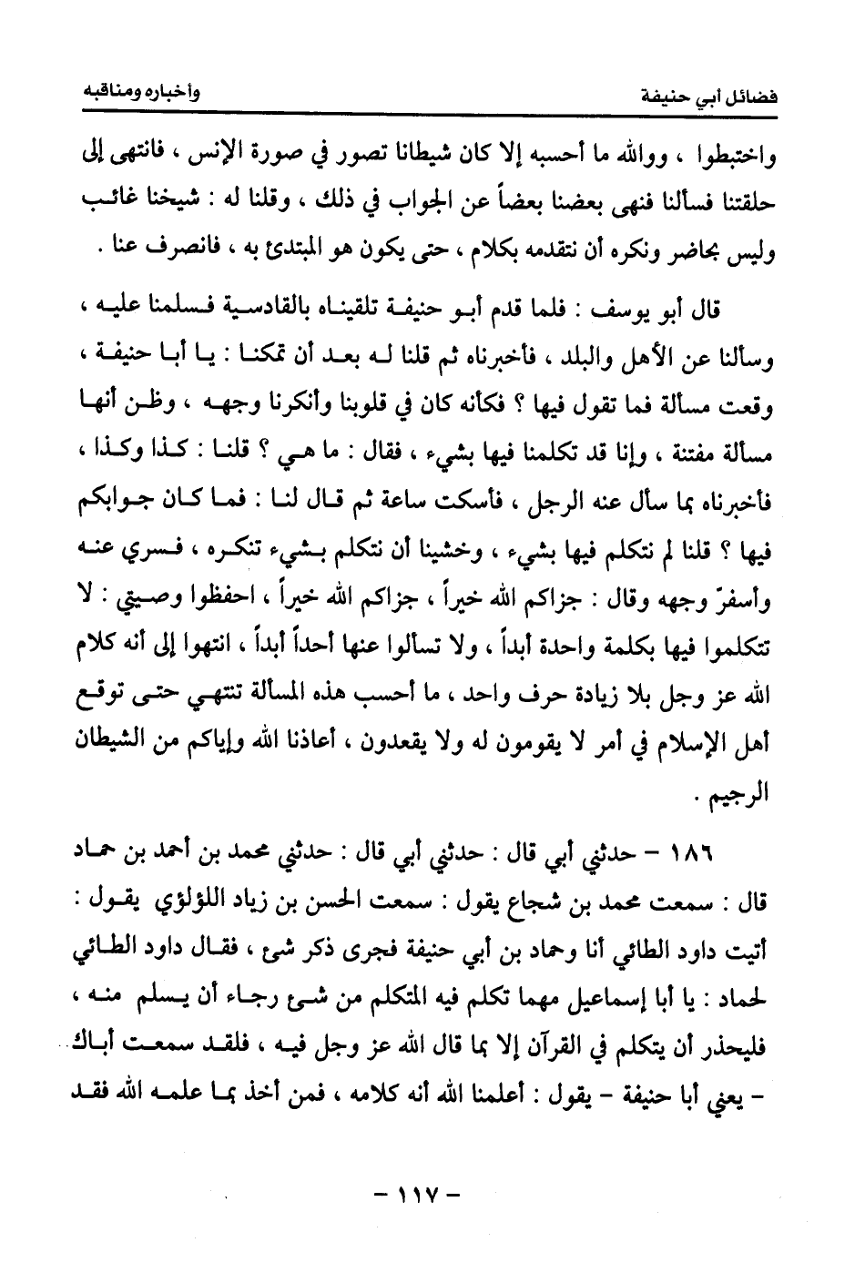 187 - حدثني أبي قال: حدثني أبي قال: قال محمد بن شجاع: وسمعت الحسن بن زياد يقول: وقال له رجل في مسألة ذكرها عن زفر وأبي يوسف: أكان زفر نظر في الكلام؟ فقال: سبحان الله ما أسخفك، تقول لأصحابنا ومشيختنا نظروا في الكلام، هؤلاء بيوت العلم والفقه، إنما يقال: نظر في الكلام لمن لا عقل له، هؤلاء كانوا أعلم بالله عز وجل وبحدود الله من أن يدخلوا في الكلام الذي تعني، ما أدركت مشيختنا أبا حنيفة ومن قبله وزفر وأبا يوسف يهمهم غير الفقه والاقتداء بمن تقدمهم، قال الرجل له: فإن فلاناً -يعني بشراً المريسي- يقول: إن قوله في القرآن قول أبي حنيفة وزفر وأبي يوسف، فقال له: كذب والله، ما سمعت أحداً منهم يتكلم في شيء من هذا، ولا بلغني ذلك عنه، فهلا قلت له: أنت لم تصحب أبا حنيفة ولا زفر، ولكن صاحبت أبا يوسف فلم طردك؟ فمن أبين كذباً من هذا.