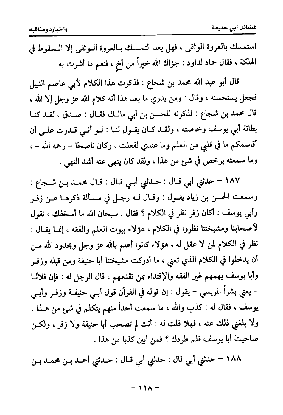 189 - حدثني أبي قال: حدثني أبي قال: حدثني أحمد بن محمد بن سلامة أبو جعفر قال: ثنا يوسف بن خلف المتطبب قال: ثنا نعيم بن حماد قال: ثنا عبد الله بن المبارك قال: كتب أبو حنيفة في بعض ما يكتب إلى بعض إخوانه: مع أن إبليس لم يقدر مع حيلته وزينته وخدعه وإضلاله الناس بألوان البدع على أن يخترع كذبة مضلة، ثم يثبتها في قلوب أهل العدل والصلاح ويجمع عليها كلمتهم حتى يُصدق بها أهل كل أفق من آفاقهم، حتى لا يأتي بلداً من بلاد المسلمين: إلا وجدت المعروفين بالفقه في دينهم والصلاح في أمورهم والعلم بسنن نبيهم صلى الله عليه وسلم، وأهل الرواية لحديثه يتخذون تلك الكلمة المضلة علماً وفقهاً إسنادهم فيها واحد، واجتهادهم فيها يوافق بعضهم بعضاً، لم يقدر إبليس وأشياعه على ذلك من أمر المسلمين فيما مضى، وهو على أن لا يقدر على ذلك من هذه الأمة أبعد، إن المسلمين في حال جماعتهم وألفتهم بهديهم وقرب نبيهم صلى الله عليه وسلم لم يكونوا ليقاروا كذباً يتقول على نبيهم صلى الله عليه وسلم بما خالف كتاب الله عز وجل وسنة نبيهم صلى الله عليه وسلم، ولا ليجهل عدل ذلك من جوره وكذب ذلك من صدقه علماؤهم وفقهاؤهم، لأنها لم تكن تجتمع على الجهل #120# والجور الظاهر، ولا الكذب المستعلن به في دينهم وعلى نبيهم صلى الله عليه وسلم، ولا ليقاروا أهله عليه يتخذونه في كل زمان من أزمنتهم فقهاً وعلماً.