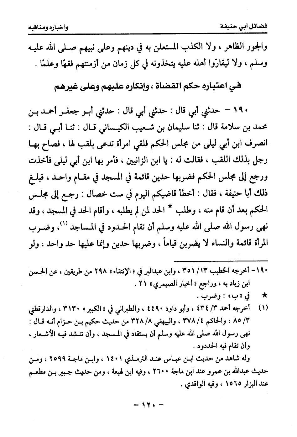 192 - حدثني أبي قال: حدثني أبي قال: حدثني محمد بن أحمد بن حماد قال: سمعت محمد بن شجاع قال: سمعت حبان يقول: -وكان من أصحاب أبي حنيفة- قال: قيل لابن أبي ليلى: إنك كلما قضيت بشيء نقضه أبو حنيفة عليك، قال: وكان ابن أبي ليلى يقضي بالقضاء فيعرض على أبي حنيفة فيكون على خلاف الصواب عنده فينقضه، ويقول للخصم: أدخل عليه كذا، فيدخل عليه الخصم ذلك الحجاج فيكسر عليه قوله، فشكى ذلك ابن أبي ليلى إلى عيسى بن موسى، فأمره عيسى ألا يفتي، قال: فسئل في منزله عن مسألة، فأبى أن يفتي وقال: إني قد قلت: إني لا أفتي.