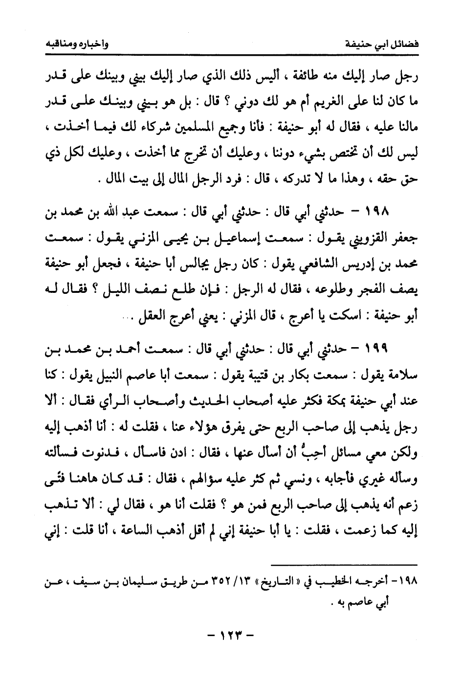 202 - حدثني أبي قال: حدثني أبي قال: حدثني أبو بكر محمد بن جعفر بن الإمام. قال: ثنا هارون بن عبد الله بن مروان الحمال قال: ثنا سليمان بن حرب، عن حماد بن زيد قال: جلست إلى أبي حنيفة بمكة فقلت له: حدثنا أيوب قال: رآني سعيد بن جبير قد جلست إلى طلق بن حبيب فقال لي: ألم أرك جلست إلى طلق، لا تجالسه. قال أبو حنيفة: كان طلق يرى القدر.