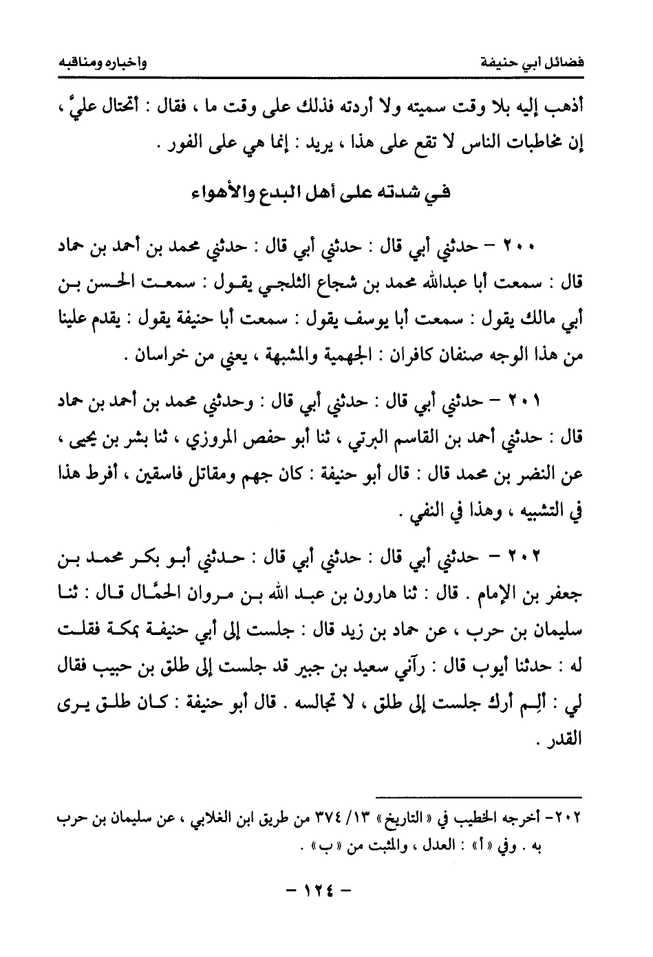 203 - حدثني أبي قال: حدثني أبي قال: حدثني محمد بن أحمد بن حماد قال: سمعت محمد بن شجاع يقول: سمعت الحسن بن أبي مالك يقول: سمعت أبا يوسف يقول: كان أبو حنيفة لا يرى أن يروي من الحديث إلا ما حفظه عن الذي سمعه منه.