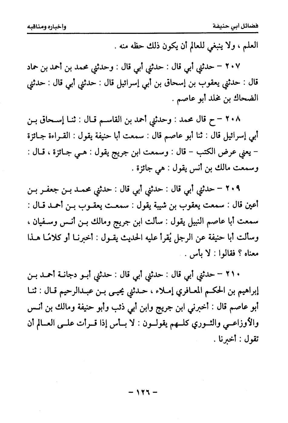 211 - حدثني أبي قال: حدثني أبي قال: ثنا محمد بن إبراهيم بن إسحاق الأصبهاني قال: ثنا إبراهيم بن عيسى الطرسوسي قال: ثنا نعيم بن حماد قال: قال عبد الله بن المبارك: قال أبو حنيفة: أتيت المدينة لأكتب عن نافع مولى ابن عمر فسمعته يقول: كال ابن عمر، فتركته وقلت: كيف أكتب عن رجل لا يحسن يقول قال ابن عمر.