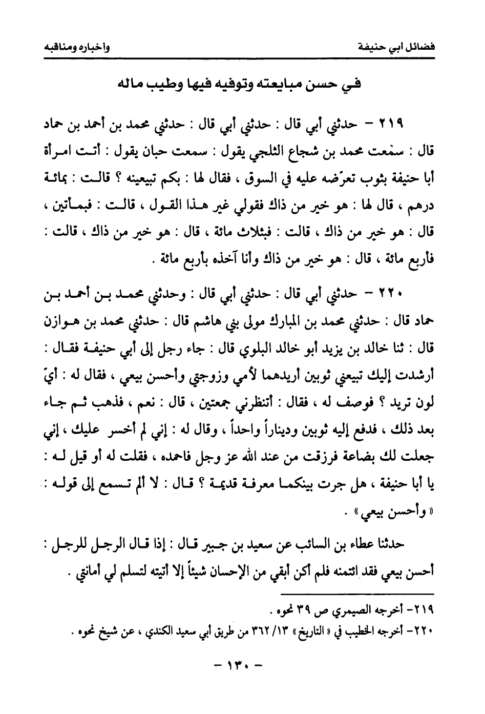 221 - حدثني أبي قال: حدثني أبي قال: حدثني محمد بن أحمد بن حماد قال: سمعت محمد بن شجاع يقول: سمعت الحسن بن زياد يقول: دخلت أنا وحماد بن أبي حنيفة على داود بن نصير الطائي، فجرى ذكر شيء، فلما أراد القيام أخرج حماد من كمه صرة فيها أربع مائة درهم، فقال له: يا أبا سليمان خذ هذه فانتفع بها، فقد بلغني ما أنت فيه من الضيق، وقد عرفت ما بيني وبينك من الصداقة، فقال له داود: ما بي إليها حاجة، فقال له حماد: إنها ليست مما كسبت، إنها من ميراثي عن أبي حنيفة، فقال له داود: هذه من ميراثك عن أبي حنيفة؟ وجعل يردد الكلام كالمتعجب من طيبها، وقال: لو قبلت شيئاً لقبلتها، وجعل ينظر إليها وإليه بالتعظيم ولم يقبل منها شيئاً رحمه الله.