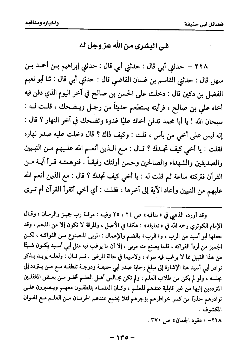 229 - حدثني أبي قال: حدثني أبي قال: حدثني محمد بن أحمد بن حماد قال: حدثني أحمد بن القاسم البرتي قال: ثنا أبو علي أحمد بن محمد بن أبي رجاء قال: سمعت أبي يقول: أُريت محمد بن الحسن في المنام، فقلت: إلى ما صرت إليه؟ قال: غفر لي، قلت: بم؟ قال: قيل لي: لم نجعل هذا العلم فيك إلا ونحن نغفر لك، قال: قلت: فما فعل أبو يوسف؟ قال: فوقنا بدرجة، قال: قلت: فأبو حنيفة؟ قال: في أعلى عليين.