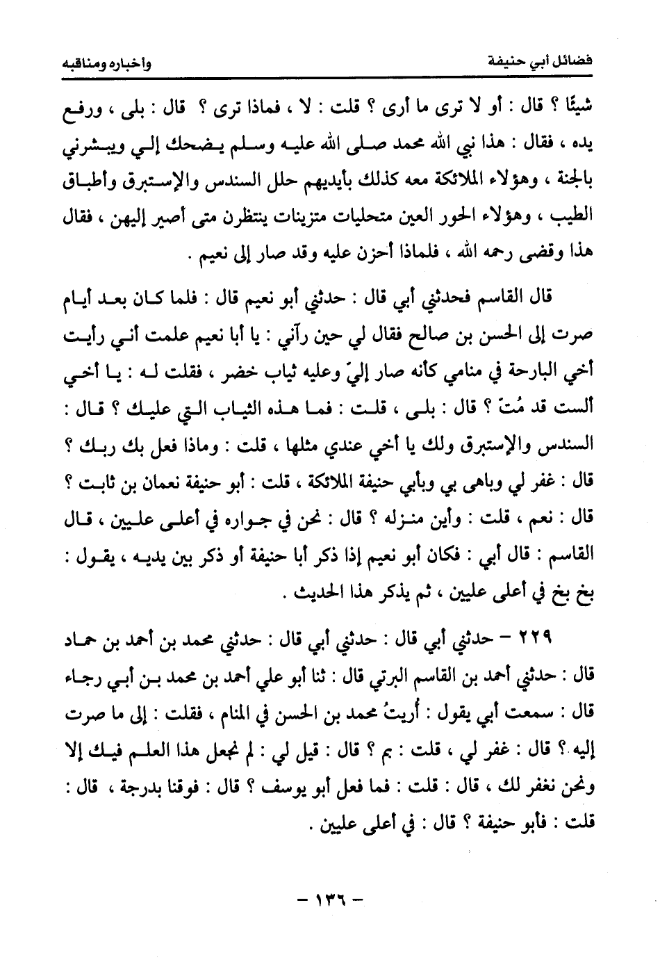 231 - حدثني أبي قال: حدثني أبي قال: حدثني محمد بن أحمد بن حماد قال: وحدثني محمد بن حماد قال: ثنا محمد بن إبراهيم الليثي قال: ثنا حسين ابن علي الجعفي قال: ثنا عباد التمار قال: رأيت أبا حنيفة في النوم فقلت: يا أبا حنيفة إلى ما صرت؟ قال: إلى سعة رحمته، قلت: بالعلم؟ قال: هيهات! للعلم شروط وآفات قل من ينجو، قلت: فبم ذلك؟ قال: لقول الناس في ما لم أكن عليه.