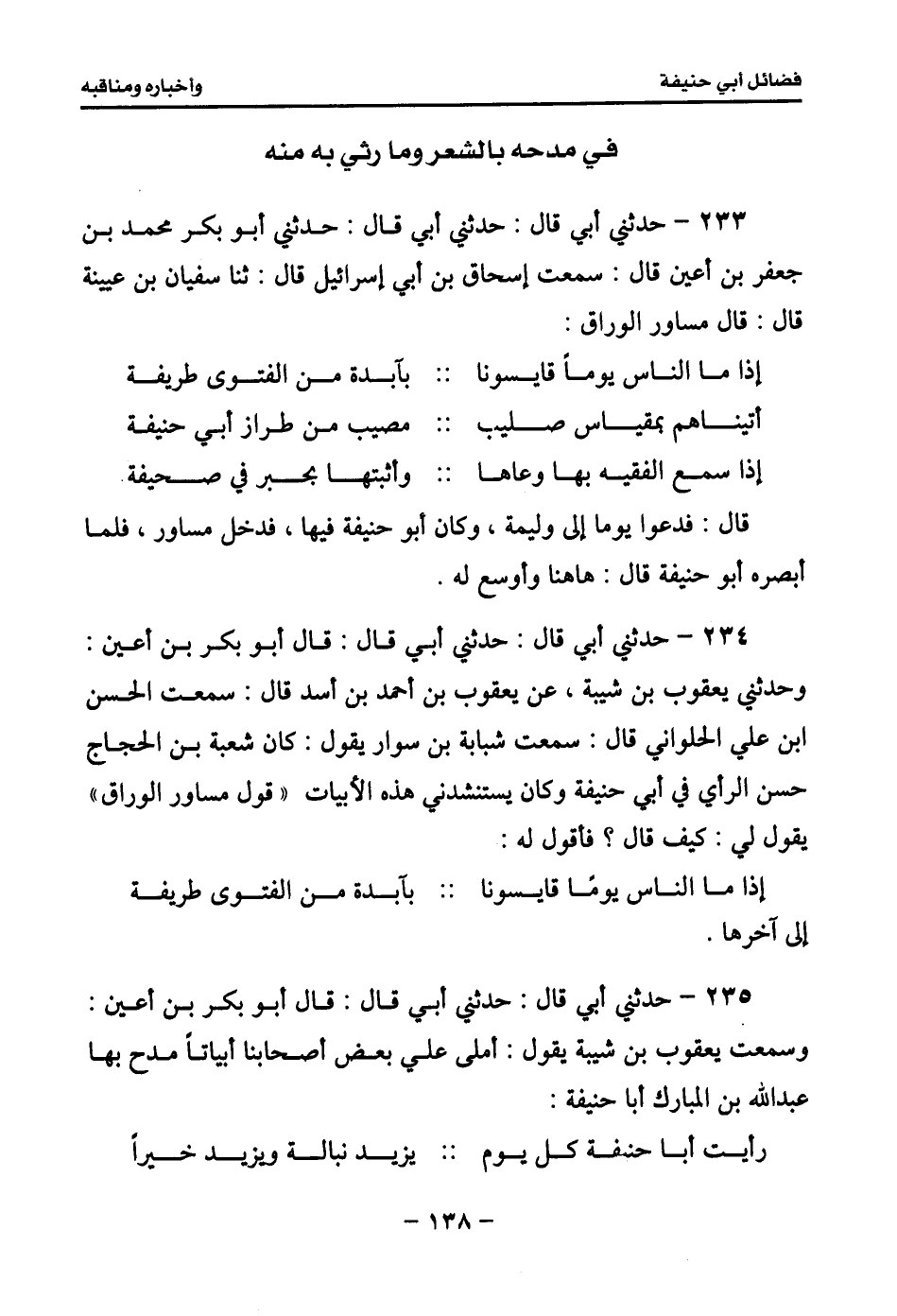 237 - حدثني أبي قال: حدثني أبي قال: حدثني أحمد بن محمد بن سلامة قال: ثنا أبو إسحاق إبراهيم بن نصر المغربي قال: ثنا زيد بن بشر قال: كنت عند محمد بن الحسن حتى أتاه شاعر الخليفة، فقال: يا أبا عبد الله! ذكرت #140# الشيخ اليوم -يريد أبا حنيفة- فقلت فيه شعراً، أفتأذن في ذكره؟ قال: قل، فأنشأ يقول: