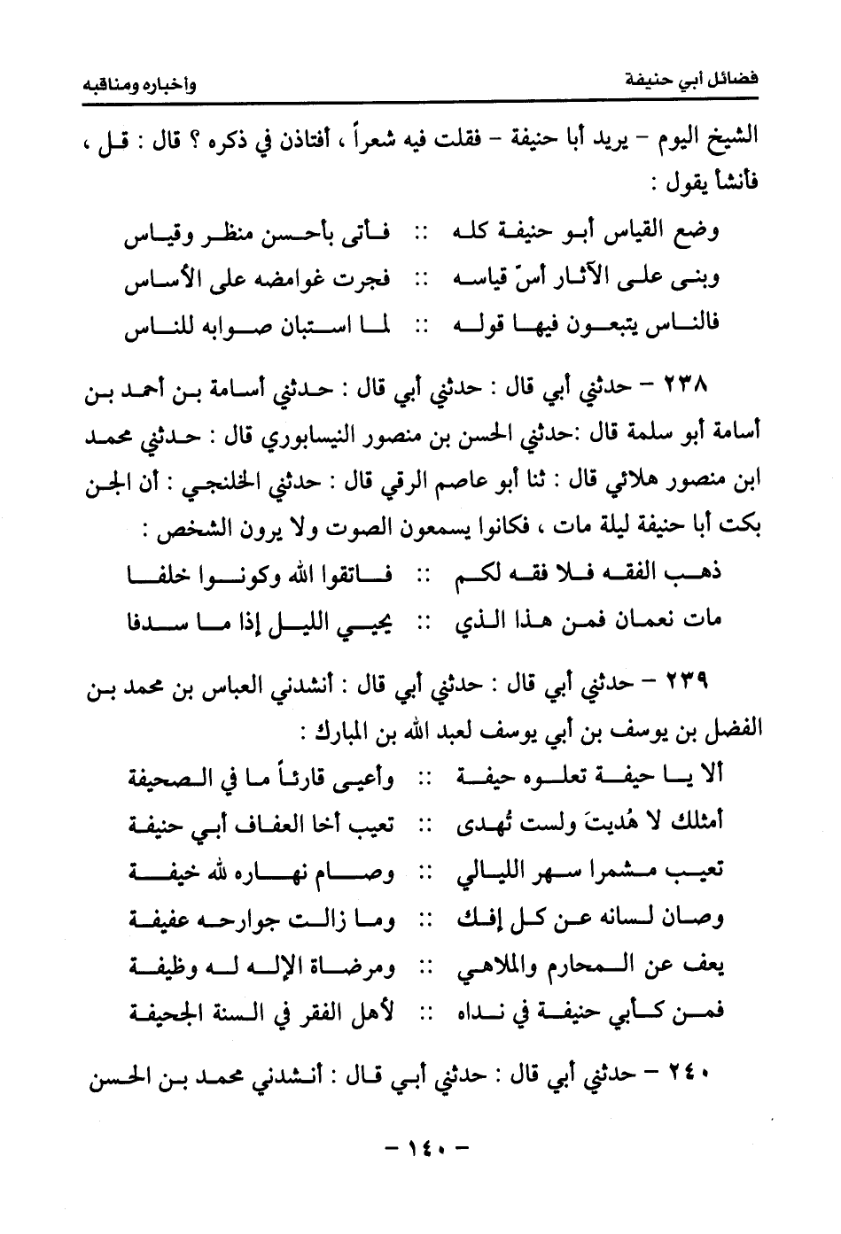 242 - حدثني أبي قال: حدثني أبي قال: سمعت أبا بشر محمد بن أحمد ابن حماد يقول: سمعت جعفر بن نوح الآدمي قال: سمعت محمد بن عيسى قال: سمعت روح بن عبادة يقول: كنت عند ابن جريج سنة خمسين ومائة، فأتاه موت أبي حنيفة، فاسترجع وتوجع وقال: أي علم ذهب، وفيها مات ابن جريج.