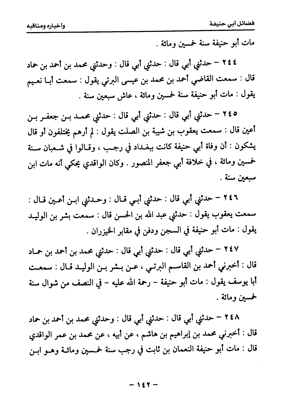 249 - حدثني أبي قال: حدثني أبي قال: حدثني محمد بن أحمد بن حماد قال: حدثني محمد بن المبارك المصيصي قال: ثنا علي بن الحسن بن شقيق قال: سمعت أبي يقول: سمعت شعبة بن الحجاج يحدث: عن حماد بن أبي سليمان قال: كان أبو حنيفة يجالسنا بحسن الهدي والفهم، فكنت أؤمله ثم شُنع عليه بما هو أعلم به منهم، فالله أعلم والله أعلم.