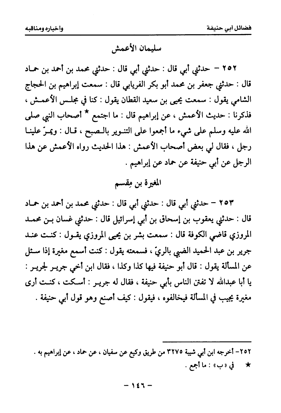 254 - حدثني أبي قال: حدثني أبي قال: حدثني محمد بن أحمد قال: حدثني محمد بن المبارك قال: ثنا محمد بن سليمان لوين، عن يحيى بن زكريا ابن أبي زائدة قال: قال لي أبي: يا بني عليك بالنعمان بن ثابت، فخذ عنه قبل أن يفوتك، قال يحيى: وربما عرضت على أبي فتياه فيعجب به، قال يحيى: وما رأينا أحداً ترك علم أبي حنيفة تورعاً.