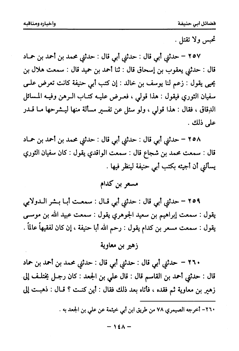 262 - حدثني أبي قال: حدثني أبي قال: حدثني محمد بن أحمد قال: حدثني محمد بن المبارك قال: ثنا إبراهيم بن سعيد الجوهري قال: ثنا المثنى بن رجاء قال: سمعت مالك بن مغول يقول: كان أبو حنيفة بصيراً بالفقه.