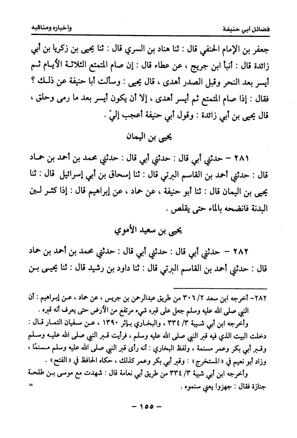 284 - حدثني أبي قال: حدثني أبي قال: حدثني محمد بن الحسن بن علي البخاري قال: ثنا روح بن الفرج قال: ثنا يحيى بن سليمان قال: ثنا عبد الله بن إدريس قال: سألت مالك بن أنس وابن أبي الزناد عن رجل قال #157# لامرأته: أنت طالق ينوي ثلاثاً؟ قالا: هي ثلاث تطليقات، قال ابن إدريس: وقال أبو حنيفة: هي واحدة، قال يحيى: ويقول أبي حنيفة نأخذ، ألا ترى أن الله تعالى قال: الطلاق مرتان، فلا يكون الطلاق إلا باللسان لا يكون بالنية.