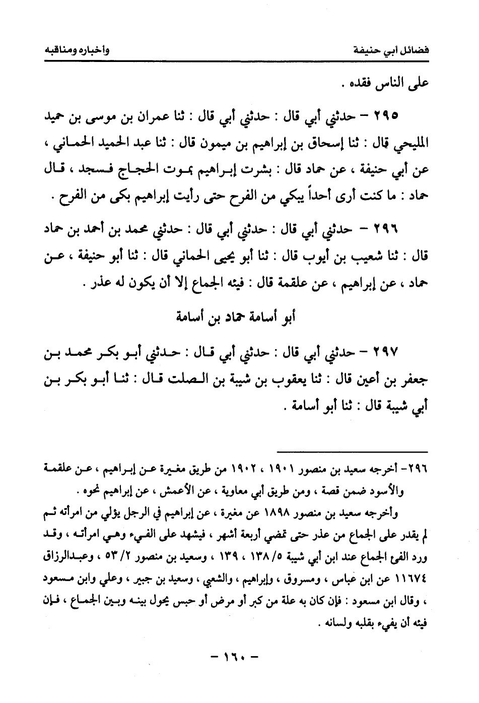 298 - قال حدثني أبي قال: حدثني أبي قال: وحدثني محمد بن أحمد ابن حماد قال: ثنا محمد بن شجاع الثلجي قال: ثنا أبو أسامة ثم قالا: ثنا أبو حنيفة عن قيس بن مسلم عن طارق بن شهاب عن عبد الله بن مسعود عن النبي صلى الله عليه وسلم قال: ((أفضل الأعمال العج والثج، فأما العج: فالعجيج بالتلبية، وأما الثج: فنحر البدن)).