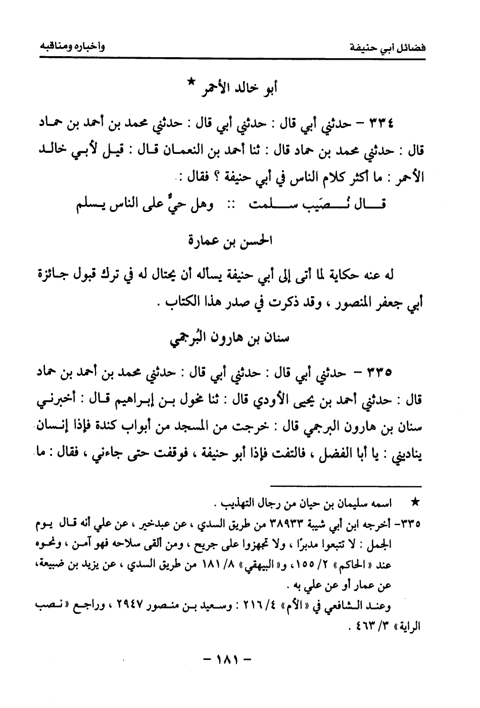 336 - حدثني أبي قال: حدثني أبي قال: حدثني محمد بن الحسن بن علي البخاري قال: ثنا بكر بن القاسم قال: ثنا يحيى بن المغيرة قال: حدثني إسماعيل بن حماد بن أبي حنيفة قال: حدثني أبي، عن جدي: أن رجلاً تقدم إليه فشكى شيئاً بينه وبين جاره، فقال له: إذا أحب أحدكم أن يستتر فليفعل، قال له: يا أبا حنيفة إن الحائط حائطه فخذه ببنيانه، قال: سبحان الله العظيم ما أنت ولا خلق على الناس بوكيل، منه أن يهدم، ومنك أن تستتر.