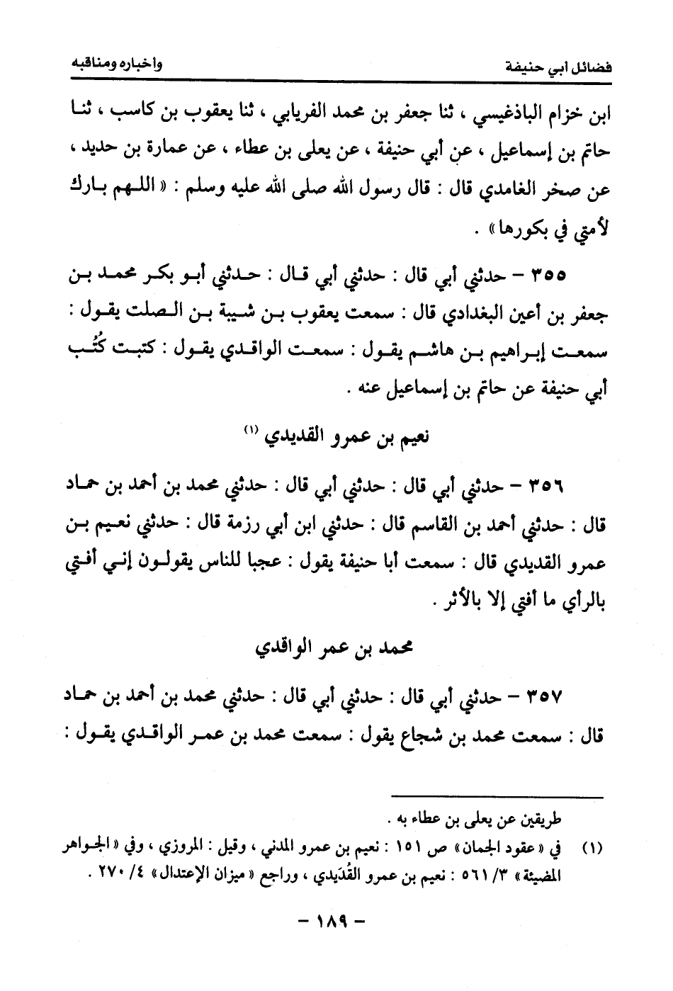 358 - حدثني أبي قال: حدثني أبي قال: حدثني محمد بن جعفر بن أعين قال: سمعت يعقوب بن شيبة قال: سمعت عبد الله بن الحسن يقول: سمعت الواقدي يقول: كنت بالكوفة وقد أشخص أبو جعفر المنصور أمير المؤمنين أبا حنيفة إلى بغداد، فكتبت كتبه لأسمعها منه فجاء نعيه.