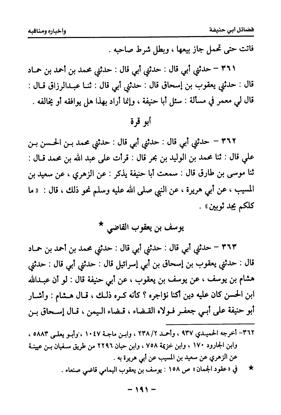 364 - حدثني أبي قال: حدثني أبي قال: حدثني محمد بن أحمد بن حماد قال: حدثني يعقوب بن إسحاق قال: سمعت أبي وذكر هشام بن يوسف الصنعاني فقال: قد كان يجالس أبا حنيفة بمكة ويفقه معه.