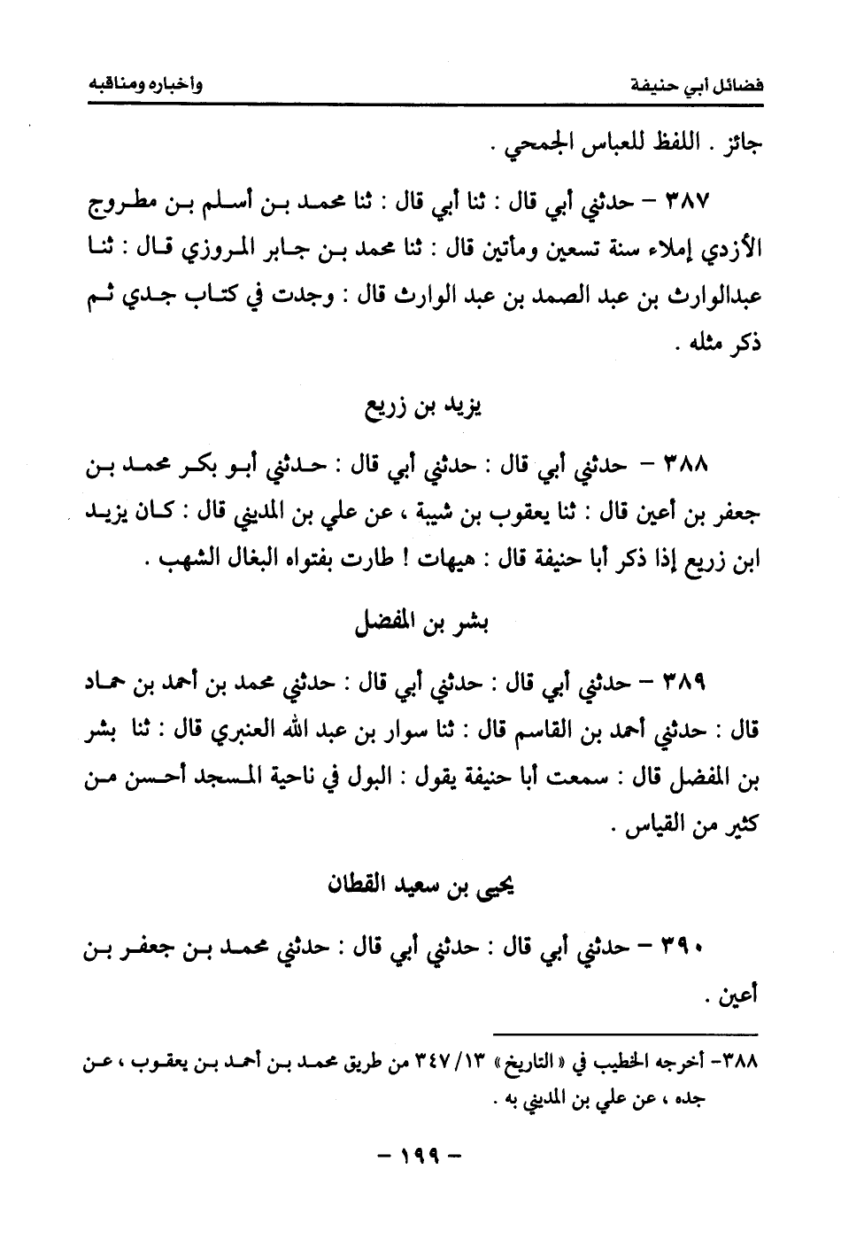 391 - ح وحدثني أبي قال: حدثني أبي قال: حدثني محمد بن أحمد بن حماد قالا: ثنا أحمد بن منصور الرمادي قال: سمعت يحيى بن معين قال: سمعت يحيى بن سعيد القطان يقول: لا نكذب الله، كم من شيء حسن قد قاله أبو حنيفة.