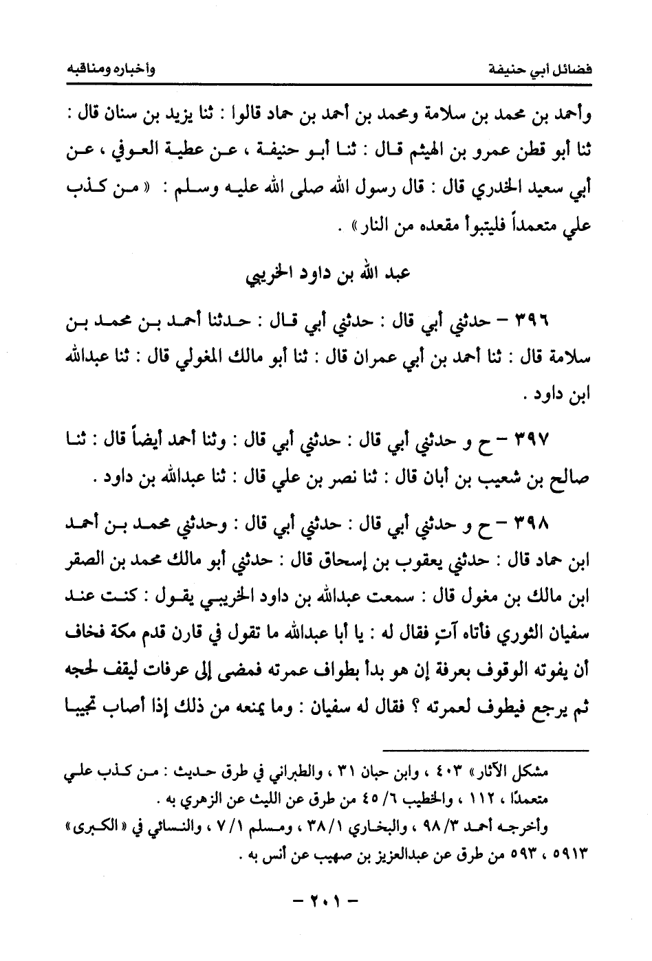 400 - حدثني أبي قال: ثنا أبي قال: سمعت أبا جعفر أحمد بن محمد #203# ابن سلامة يقول: سمعت أحمد بن أبي عمران يقول: سمعت هلال بن يحيى يقول: سمعت يوسف بن خالد السمتي يقول: جالست أبا حنيفة سنتين ونصف، فما سمعته لحن في شيء إلا في حرف واحد، زعم أهل اللغة أن له فيه مخرجاً.