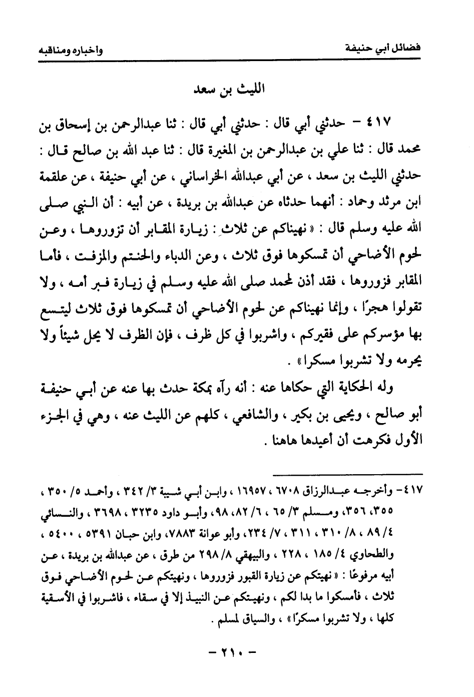 419 - حدثني أبي قال: حدثني أبي قال: حدثني محمد بن أحمد بن حماد قال: حدثني محمد بن هاشم البعلبكي قال: ثنا شعيب بن إسحاق، عن أبي حنيفة، عن حماد، عن إبراهيم قال: أخطأ الناس في قولهم: كل مسكر حرام، إنما هو كل سكر حرام، قال شعيب: كأني أسمعه من فلق فيه -يعني أبا حنيفة- يقول: إني أخاف أن يكون هو الذي أخطأ إني أخاف أن يكون هو الذي أخطأ.