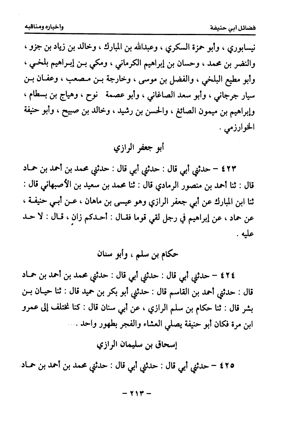 426 - حدثني أبي قال: حدثني أبي قال: حدثني محمد بن أحمد بن حماد قال: حدثني يعقوب بن إسحاق قال: سمعت محمود بن غيلان قال: ثنا علي ابن الحسن بن شقيق قال: سمعت أبا حمزة السكري يقول: سمعت أبا حنيفة يقول: إذا جاء الحديث الصحيح الإسناد عن النبي صلى الله عليه وسلم أخذنا به، وإذا جاء عن أصحابه تخيرنا، ولم نخرج من قولهم، وإذا جاء عن التابعين زاحمناهم.