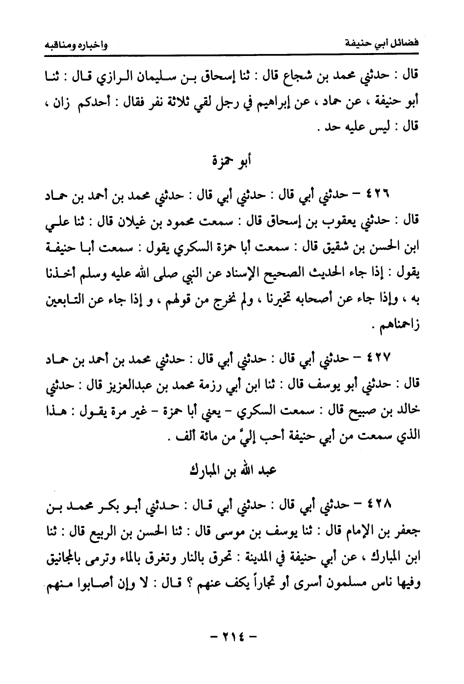 429 - حدثني أبي قال: حدثني أبي قال: حدثني محمد بن أحمد بن حماد قال: حدثني أحمد بن القاسم قال: حدثني ابن أبي رزمة قال: حدثني عمرو بن النضر بن قديد قال: سمعت عبد الله بن المبارك يقول: أنبأ النعمان، قيل: ومن النعمان؟ قال: النعمان بن ثابت الذي يقال له أبو حنيفة، ومن مثل أبي حنيفة؟.