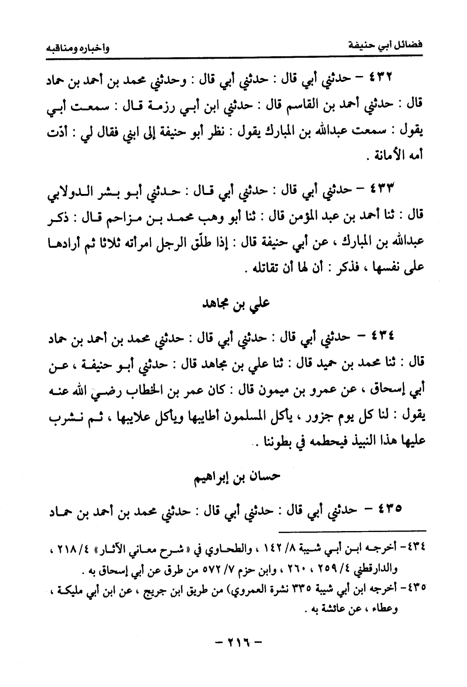 436 - حدثني أبي قال: حدثني أبي قال: حدثني محمد بن أحمد بن حماد قال: حدثني يعقوب بن إسحاق بن أبي إسرائيل قال: حدثني أبي قال: حدثني أبو مطيع قاضي بلخ قال: ثنا أبو حنيفة، عن حماد، عن إبراهيم: أنه قال في رجل قذف رجلاً بالكوفة وآخر بالبصرة وآخر بواسط، فضرب الحد قال: هو لذلك كله، وكذلك إن سرق غير مرة من أناس شتى فقطع، كان القطع لذلك كله، وكذلك الزنا، وكذلك شرب الخمر.