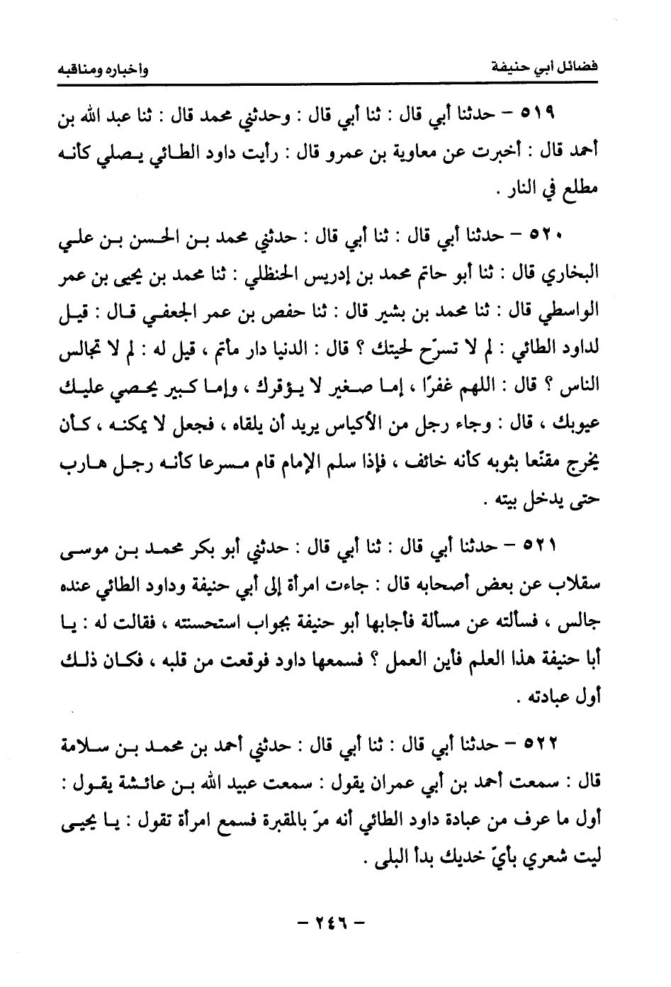 525 - حدثنا أبي قال: ثنا أبي قال: حدثني محمد بن الحسن بن علي قال: ثنا أبو حاتم محمد بن إدريس الرازي قال: ثنا محمد بن يحيى بن عمر قال: ثنا محمد بن بشير قال: ثنا حفص بن عمر الجعفي قال: كان داود الطائي قد ورث عن أمه أربع مائة درهم، فمكث يتقوتها ثلاثين عاماً، فلما نفدت جعل #248# ينقض سقوف الدويرة فيبيعها، حتى باع الخشب والبواري واللبن حتى بقي نصف سقف، وكان حائط داره من هذا اللبن العرزمي الذي يجعل في الكناسات، وبابه خلاف مرفوع وحائطه قصير، لو أن غلاماً وثب سقط إلى الدار، فجاءه صديق له يوماً فقال: لو أعطيتني يا أبا سليمان هذه فأبضعتها لك، لعلنا نستفصل لك فيها شيئاً تنتفع به، فما زال به حتى دفعها إليه، ثم فكر فلقيه بعد عشاء الآخرة فقال: أرددها علي، قال: ولم؟ قال: أخاف أن يدخل فيها شيء غير طيب فأخذها، وقال له الرجل الداخل عليه: يا أبا سليمان بعت كل شيء من الدار حتى بقيت تحت نصف سقف فلو سويت هذا السقف فكان يكنك من المطر والحر والبرد، قال: اللهم غفراً كانوا يكرهون فضول النظر كما يكرهون فضول الكلام، يا عبد الله أخرج عني، فقد شغلت علي قلبي، إني أبادر جفوف القلم وطئ الصحيفة.