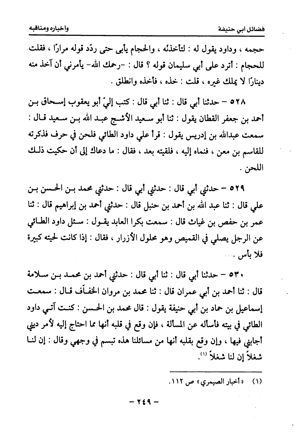 531 - حدثنا أبي قال: ثنا أبي قال: كتب إلي إسحاق بن أحمد بن جعفر يقول: ثنا أبو سعيد الأشج قال: ثنا عبد الله بن عبد الكريم بن حسان، عن حماد بن أبي حنيفة قال: دخلت على داود الطائي وإذا الباب عليه مصفق فسمعته يقول: اشتهيت جزراً فأطعمتك جزراً ثم اشتهيت جزراً وتمراً آليت أن لا تأكلينه أبداً، فسلمت ودخلت فإذا هو جالس وحده يعاتب نفسه.