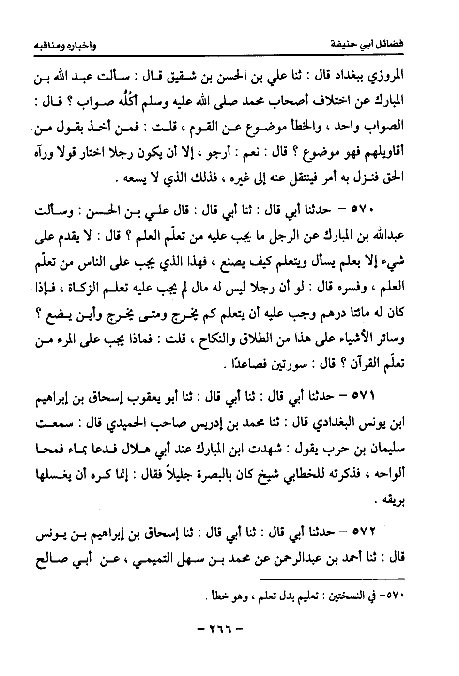 574 - حدثنا أبي قال: ثنا أبي قال: حدثني محمد بن أحمد بن الطفيل قال: ثنا أبو أمية محمد بن إبراهيم قال: ثنا سعيد بن نصير قال: سمعت عبد الصمد يقول: سمعت إسماعيل الطوسي يقول: قال عبد الله بن المبارك: إذا مات الفضيل بن عياض ارتفع الحزن.