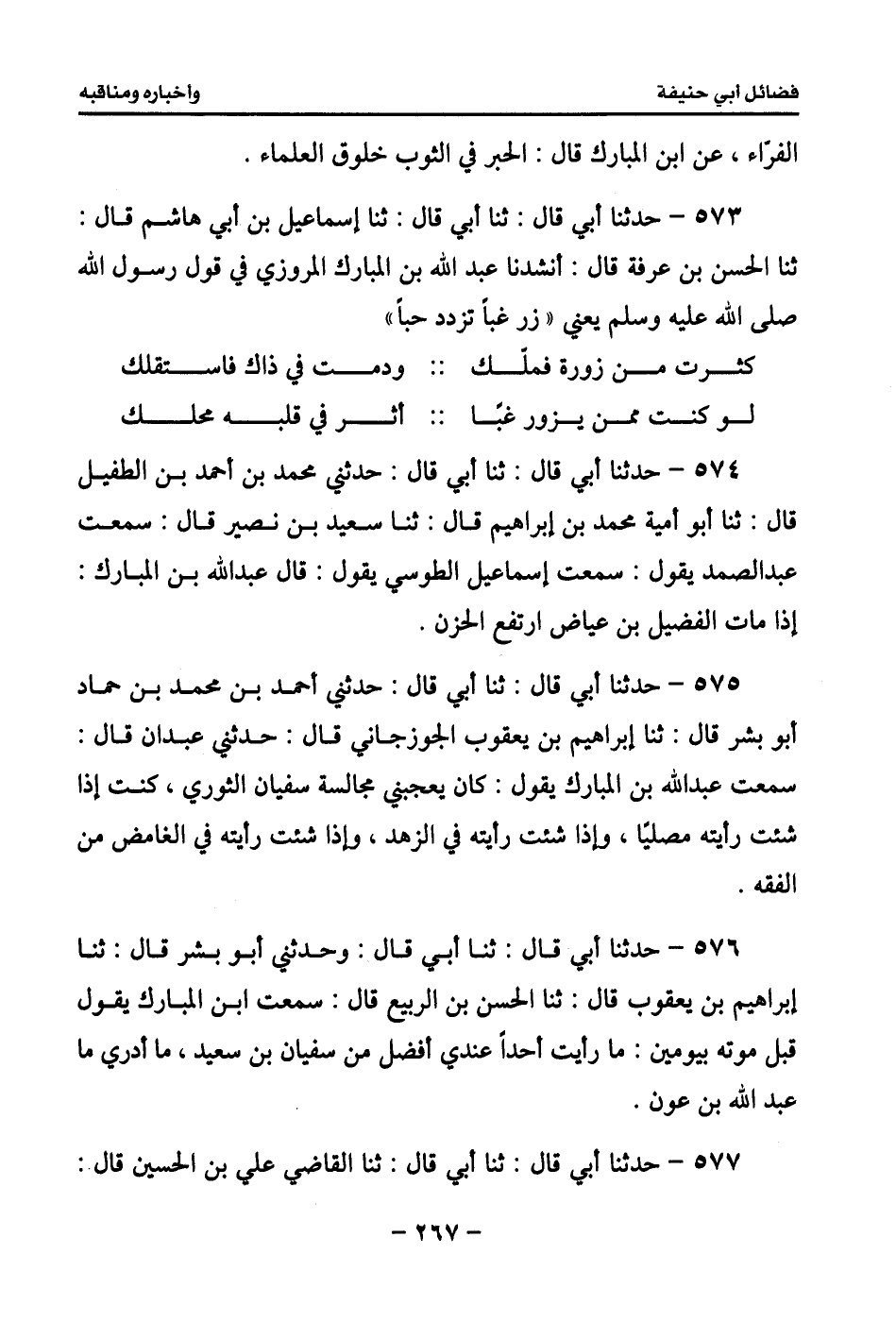 580 - حدثنا أبي قال: ثنا أبي قال: ثنا أحمد بن محمد بن سلامة قال: حدثني أبو حامد أحمد بن علي النيسابوري قال: سمعت علي بن الحسن الرازي يقول: ثنا أبو سليمان قال: سمعت ابن المبارك يقول: سألت أبا حنيفة عن الرجل يبعث بزكاة ماله من بلد إلى بلد آخر؟ فقال: لا بأس بأن يبعثها من بلد إلى بلد آخر لذي قرابته.