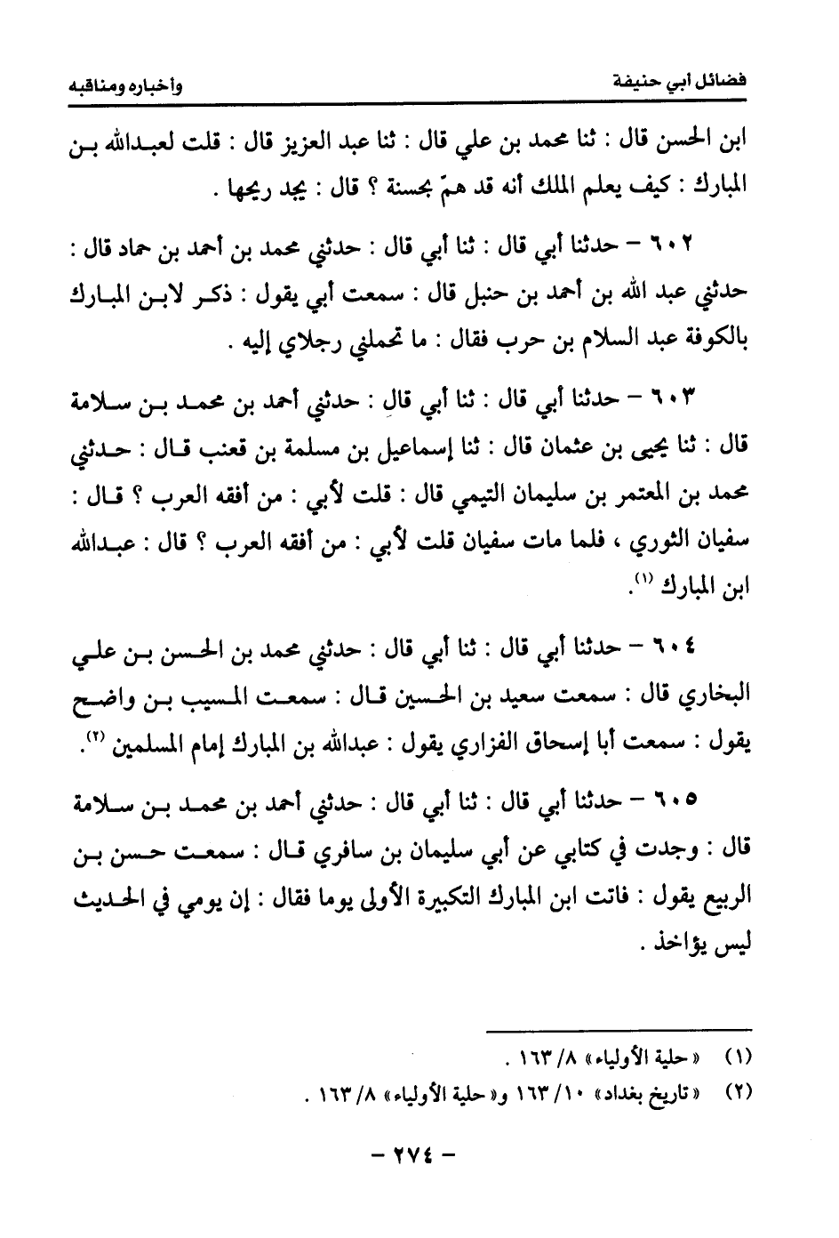 608 - حدثنا أبي قال: ثنا أبي قال: ثنا أحمد بن محمد بن سلامة قال: ثنا يحيى بن عثمان قال: ثنا نعيم قال: ثنا ابن المبارك قال: كل من وصف لي بخير وجدته كما وصف لي إلا رجلين: حيوة بن شريح بمصر، وعبد الله بن عون بالبصرة، فإني أصبتهما أكثر مما وصفا لي.