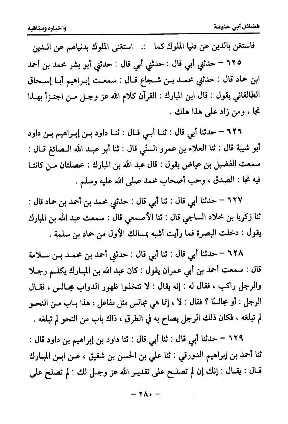 631 - حدثنا أبي قال: ثنا أبي قال: وحدثني محمد بن أحمد بن حماد قال: ثنا أحمد بن عبد المؤمن قال: ثنا أبو وهب قال: سئل عبد الله بن المبارك عن دردي الخمر، فقال: هو حرام، قال: وأكره دردي النبيذ الذي يسكر، ولا أكره دردي النبيذ الذي لا يسكر، قال عبد الله بن المبارك: وكان أبو حنيفة يكره بيع المنصف قال: وسئل عبد الله بن المبارك: عن أكل لحم العقعق فقال: كرهه أبو حنيفة، قال: وسئل عبد الله بن المبارك: عن وقت العشاء الآخرة، فذكر عن سفيان: إلى نصف الليل، وذكر عن ابن عباس: حتى يصبح، وذكر عن أبي حنيفة: حتى يصبح.