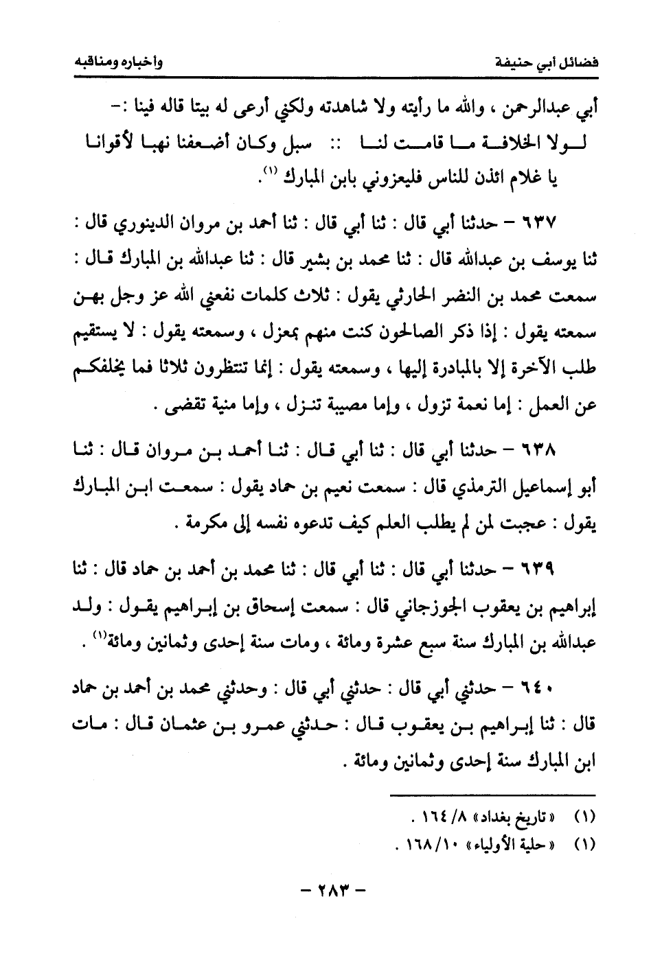641 - حدثنا أبي قال: ثنا أبي قال: وحدثني محمد بن أحمد بن حماد قال: سمعت سعيد بن رحمة بن نعيم المصيصي يقول: خرج عبد الله بن المبارك من المصيصة في شعبان سنة إحدى وثمانين ومائة، فشيعه أبو إسحاق الفزاري ومخلد بن حسين وعلي بن بكار مشاة إلى باب الشام يبكون، ثم قدم علينا إسماعيل الجعفري الكوفي فقال لأبي إسحاق: يا أبا إسحاق، شهدت عبد الله ابن المبارك بهيت، وقد خرج عليلاً من السفينة فمات بها ليلة الثلاثاء لصبيحة الأربعاء لثلاث عشرة مضت من رمضان، فبكى أبو إسحاق بكاءً شديداً وجزع، وعزاه الناس.