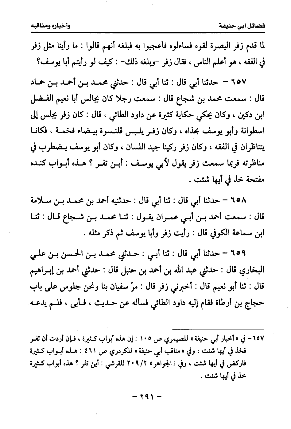 663 - حدثنا أبي قال: ثنا أبي قال: وحدثني أحمد بن محمد بن سلامة قال: سمعت أحمد بن أبي عمران يقول: سمعت سوار بن عبد الله العنبري القاضي يقول: سمعت أبا عاصم يقول: قال زفر بن الهذيل: كل أقوالي هذه قد قالها أبو حنيفة قبلي، ثم وقف منها على أشياء لم أقف أنا عليها فخالفها لما وقف عليه منها وثبت أنا عليها، قال أحمد بن أبي عمران: فأنكرت ذلك فأتيت محمد بن شجاع فحدثته بذلك، فقال لي: مكانك، ثم دخل منزله وخرج وفي يده كتاب فقرأ علي منه هذه الحكاية عن أبي عاصم كما سمعتها من سوار العنبري.